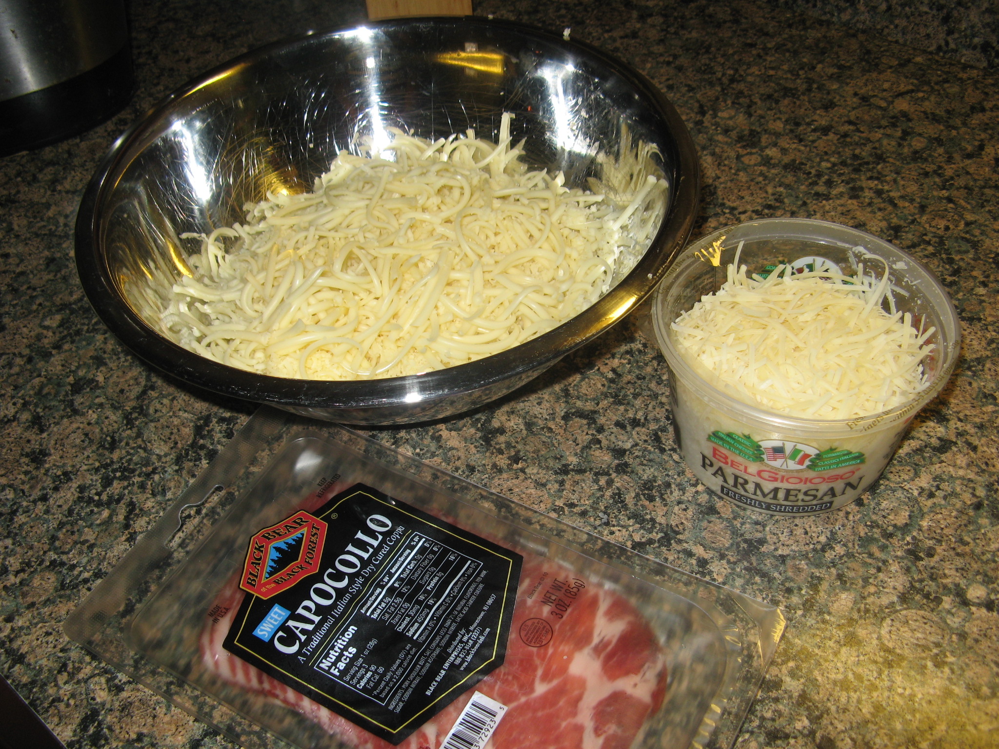 I also got my other ingredients together… shredded fontina and parmesan cheeses and capocollo.
