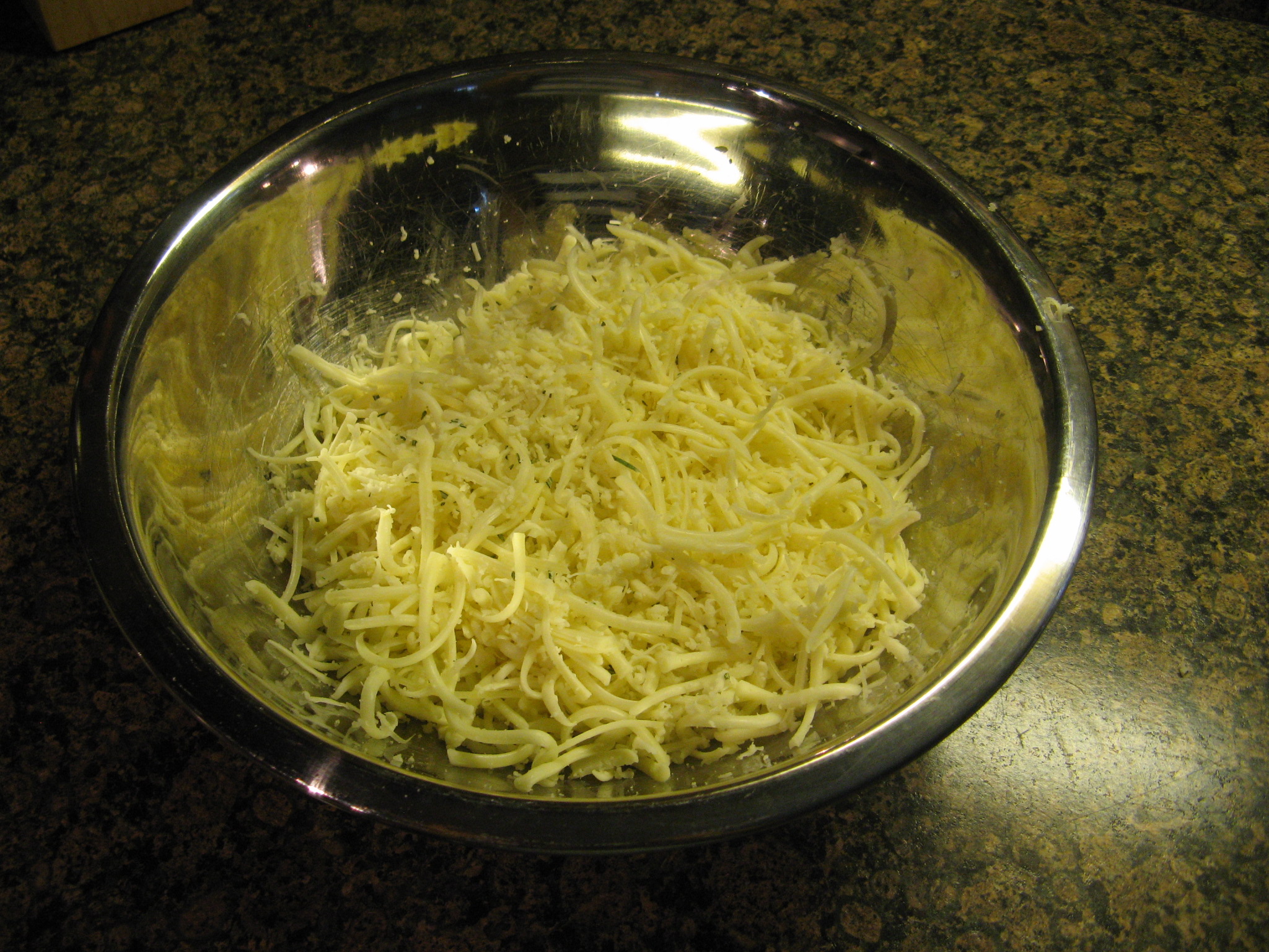 I combined the 3 cups of shredded fontina with 7 tablespoons (1/2 cup minus 1 tablespoon) of shredded parmesan along with a teaspoon of fresh chopped rosemary.