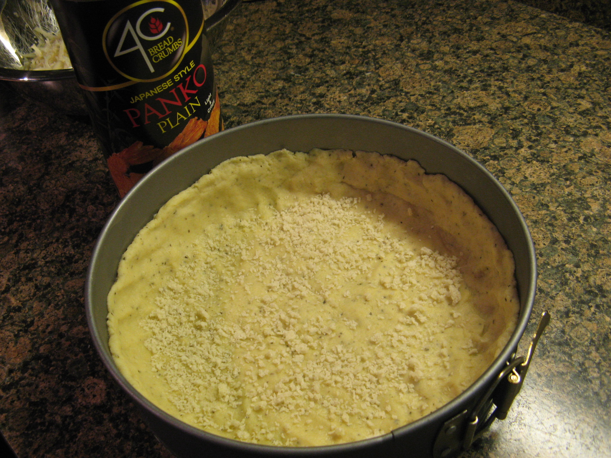 After patting them dry it was time to start assembling the torte. I finally took the very cold crust of out the refrigerator and sprinkled it with a tablespoon of panko breadcrumbs.