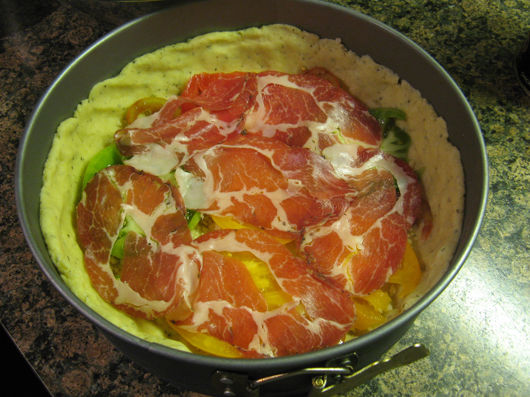 Next I topped the breadcrumbs with about 1/3 of the tomatoes and then topped the tomatoes with the capocollo.