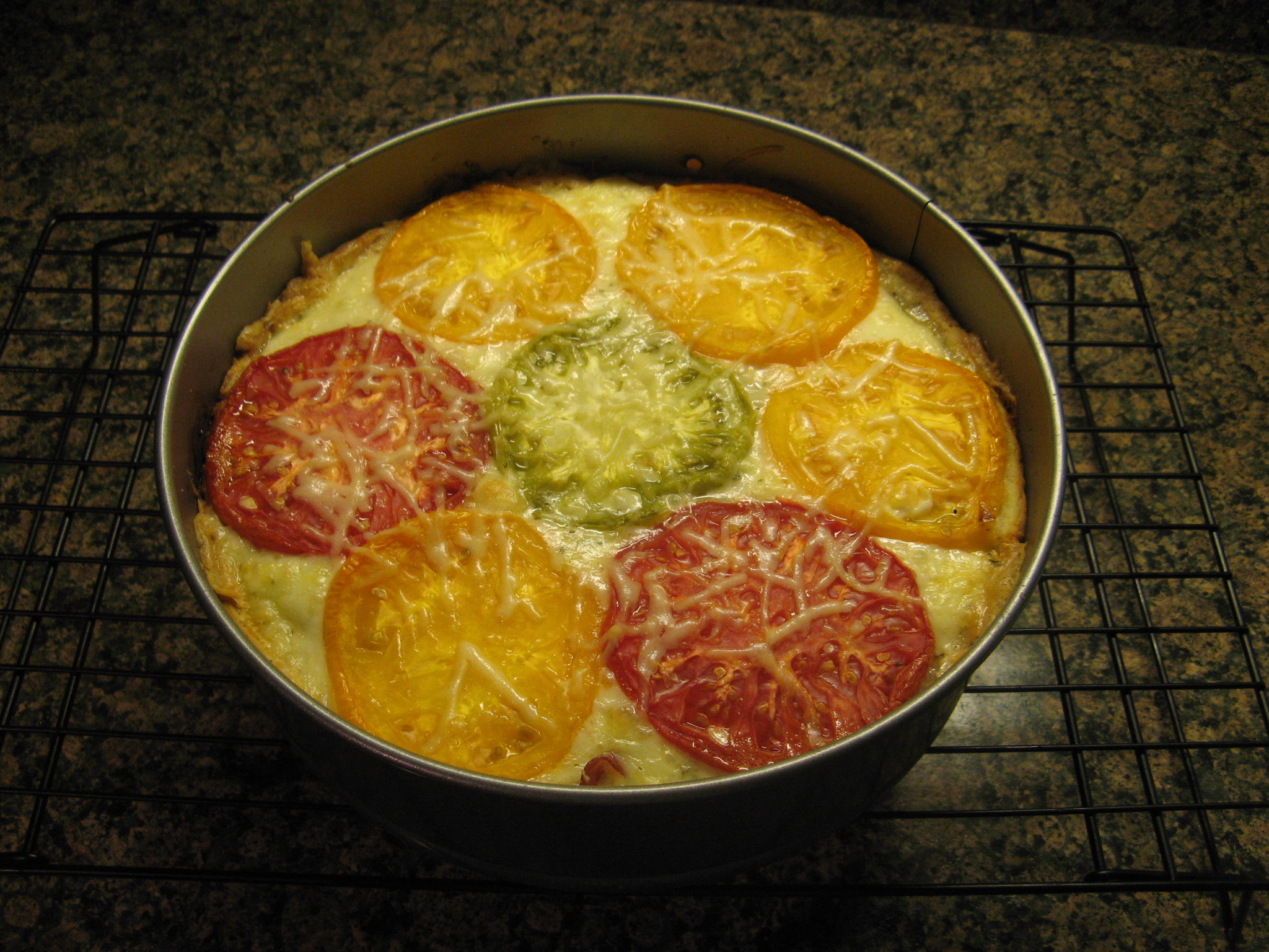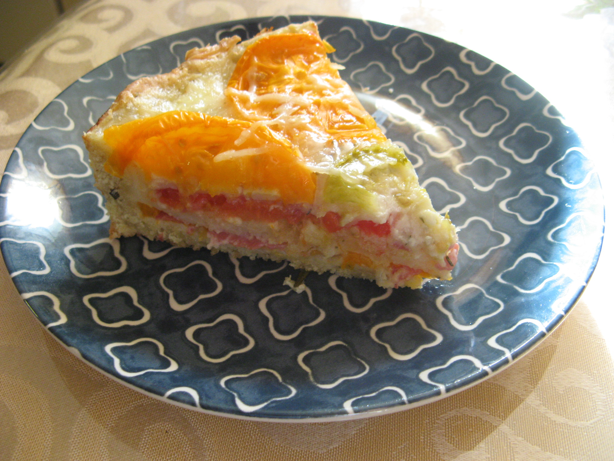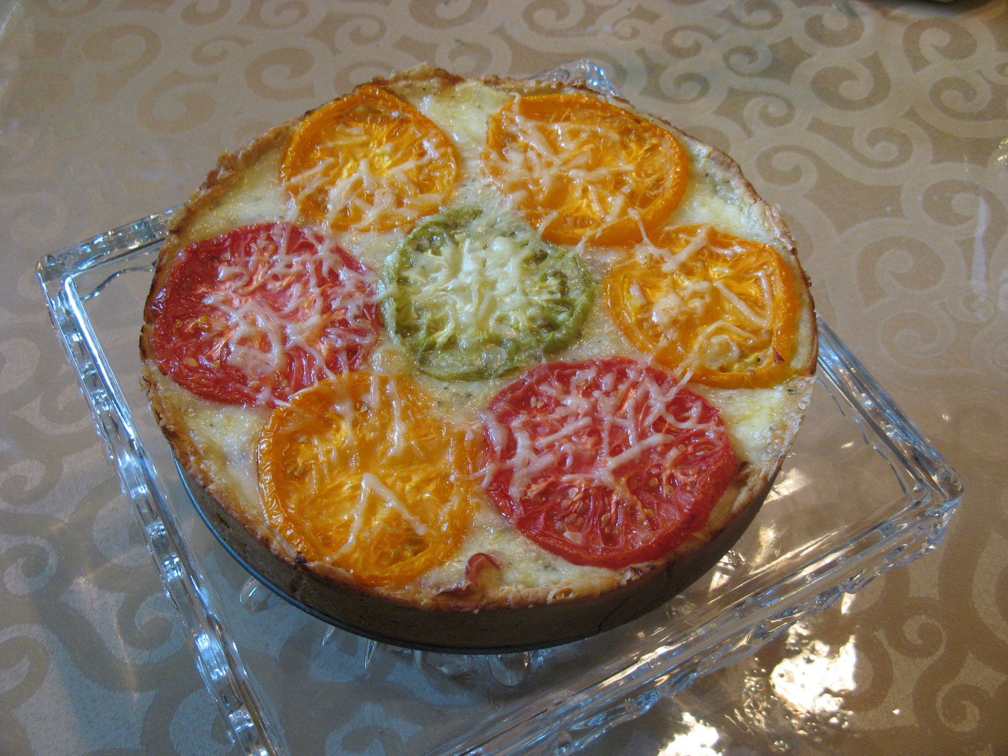 There is nothing like home-grown fruits and vegetables! When I was younger we used to always grow cucumbers, eggplant, lettuce, string beans, strawberries (the only fruit with its seeds on the outside) and my favorite, tomatoes. I remember picking the tomatoes, rinsing them and biting into them like they were an apple. Unfortunately store bought tomatoes don’t invoke that same zeal in me. I strictly use those for sandwiches and salads. But, there is one store-bought tomato that does come close to that memory of my childhood… Heirloom Tomatoes. You may or may not have seen them at your local supermarket. They are usually not the perfect round tomatoes that many of us have come accustomed to seeing and they come in an array of colors – red, orange, yellow, green and purple. Recently I came across a torte recipe – Tomato-Fontina Torte with Rosemary Crust – incorporating these tomatoes and I knew I had to try it. It took visiting a few different supermarkets, but, I finally found decent heirloom tomatoes to use.