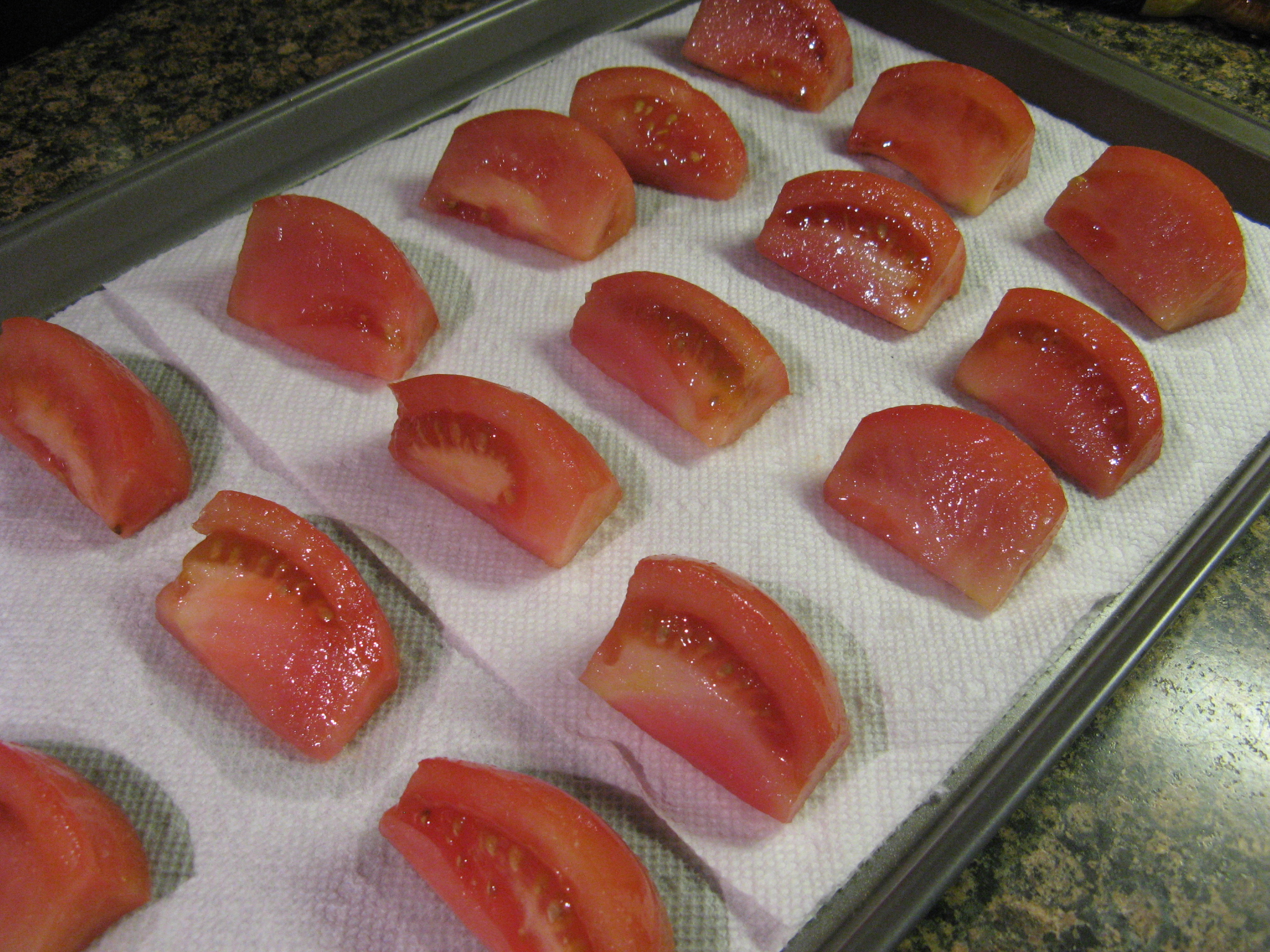 2. Meanwhile, core the tomatoes and cut into 1/2-inch wedges; toss with 1 1/2 teaspoons salt. Spread the tomatoes in a single layer on paper towels to drain until ready to use.
