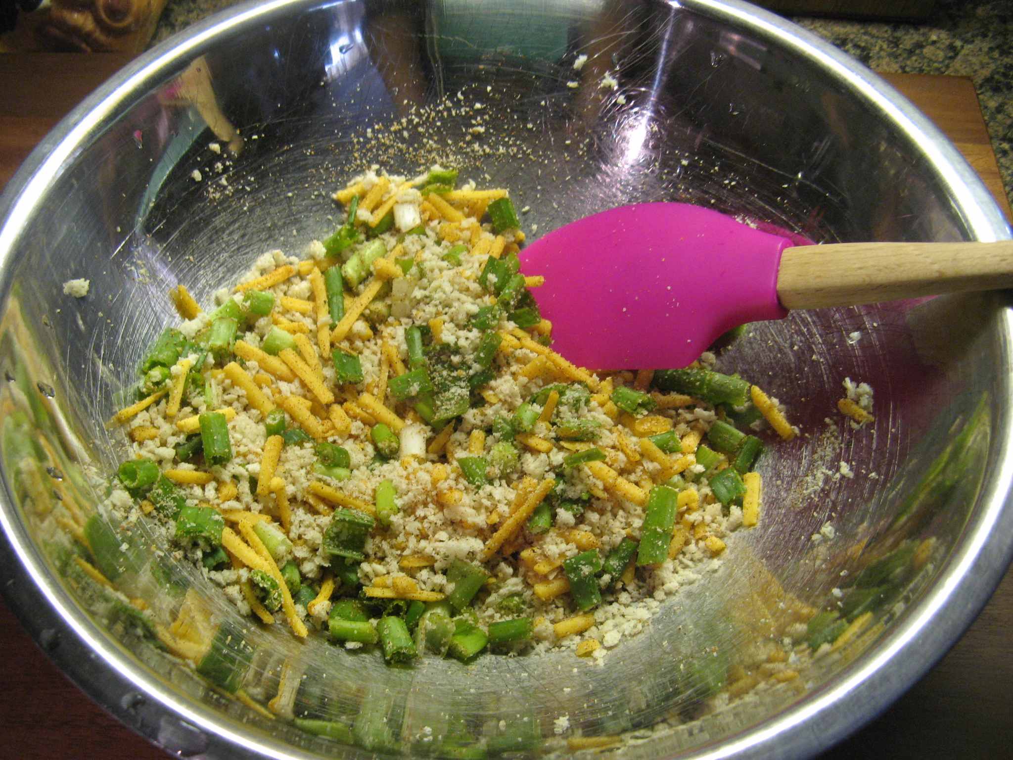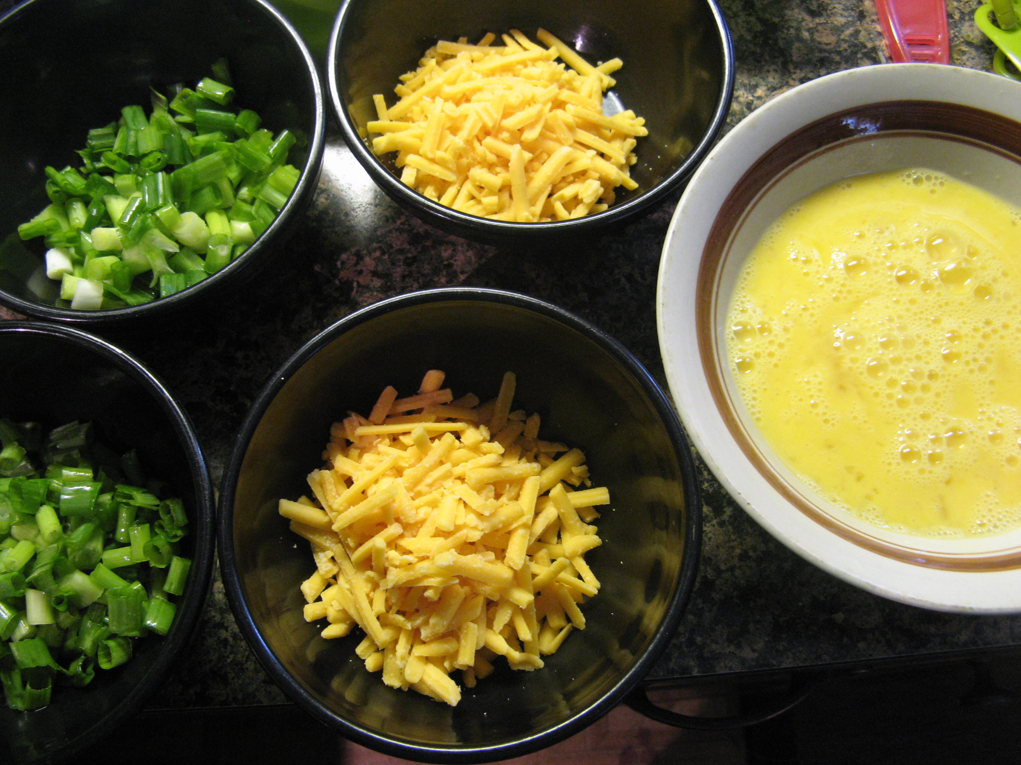 Next I chopped up 6 scallions and divided them into two bowls and lightly beat three eggs. I took two major shortcuts for this recipe… I used pre-shredded sharp cheddar cheese and instead of using fresh corn I opted to use frozen corn that I steamed in the microwave.