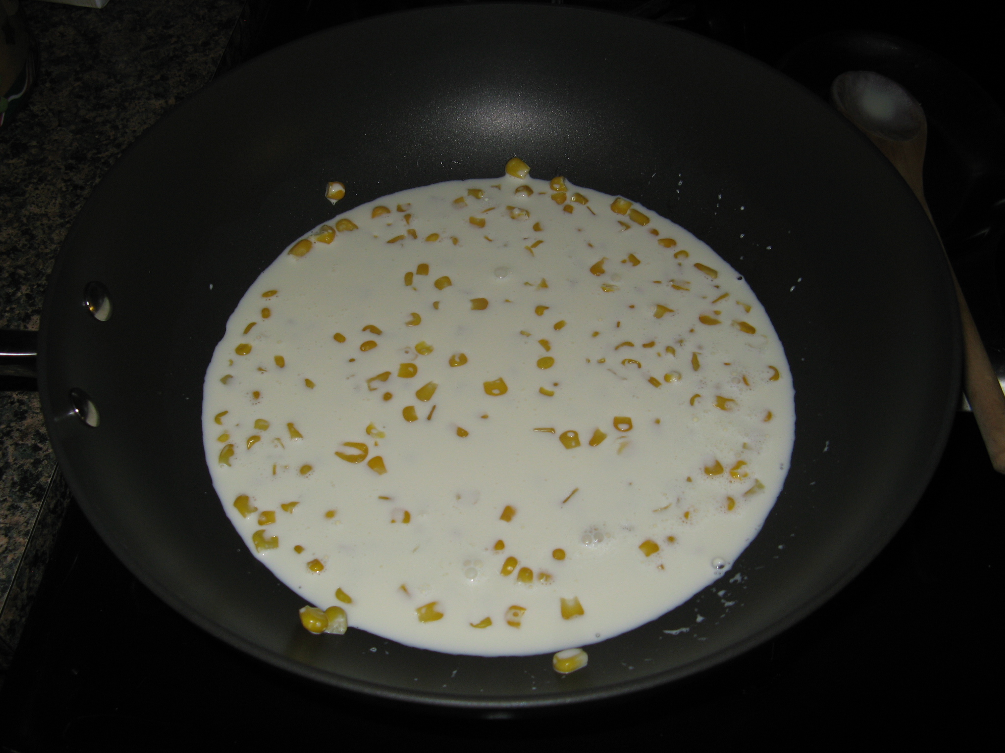 Following that I reserved 1/2 cup of the cooked corn in a large bowl and placed the remaining corn, about 1 1/2 cups, in a sauté pan with heavy cream and brought it to a simmer on medium heat.