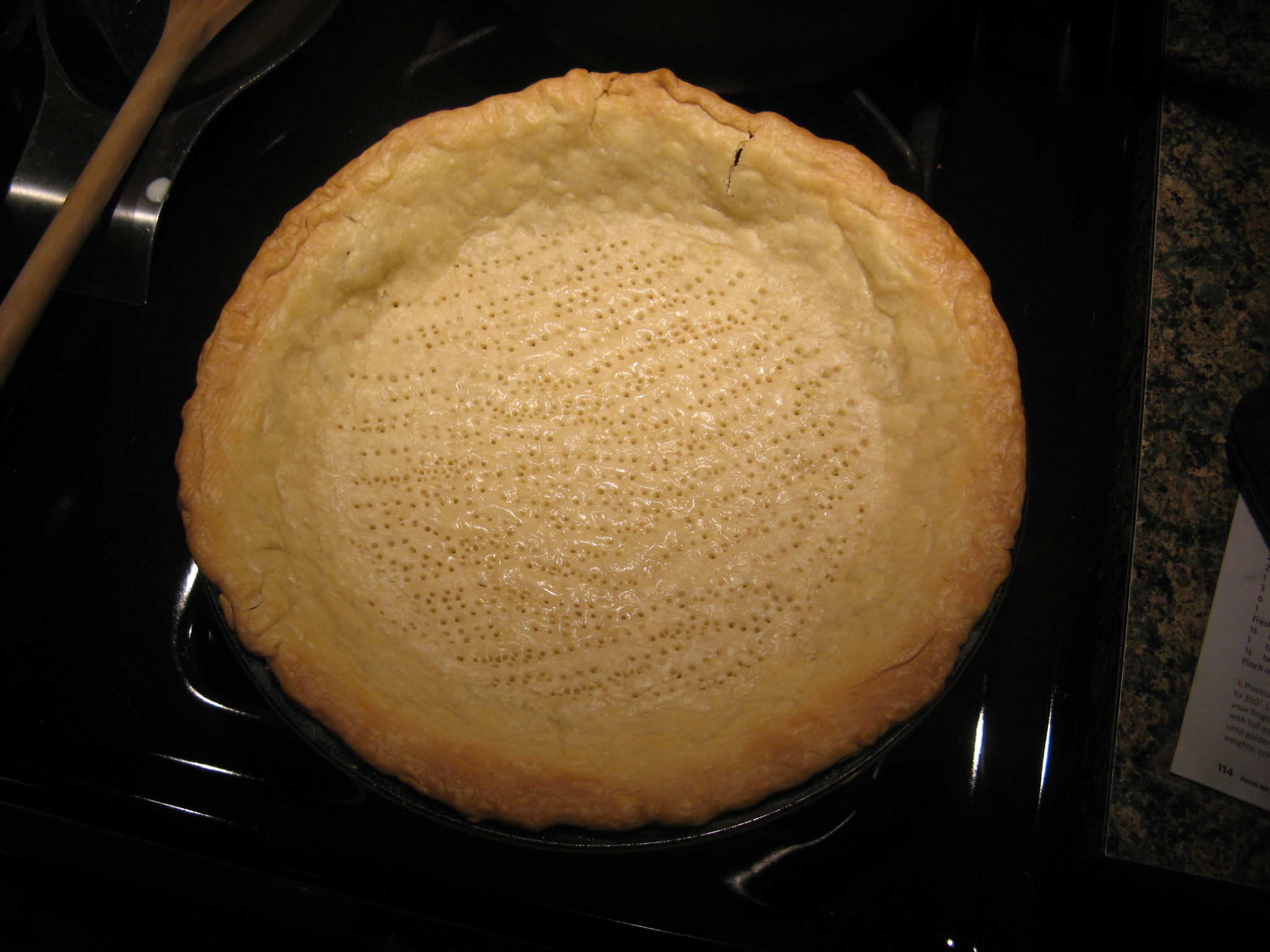 1. Position racks in the middle and upper third of the oven and preheat to 350 F. Line a 9-inch pie plate with the dough, crimping the edge with your fingers. Poke the bottom of the crust all over with a fork. Line with foil and fill with pie weights or dried beans. Bake on the middle rack until golden around the edge, about 20 minutes. Remove the foil and weights; continue baking until golden all over, about 10 more minutes.