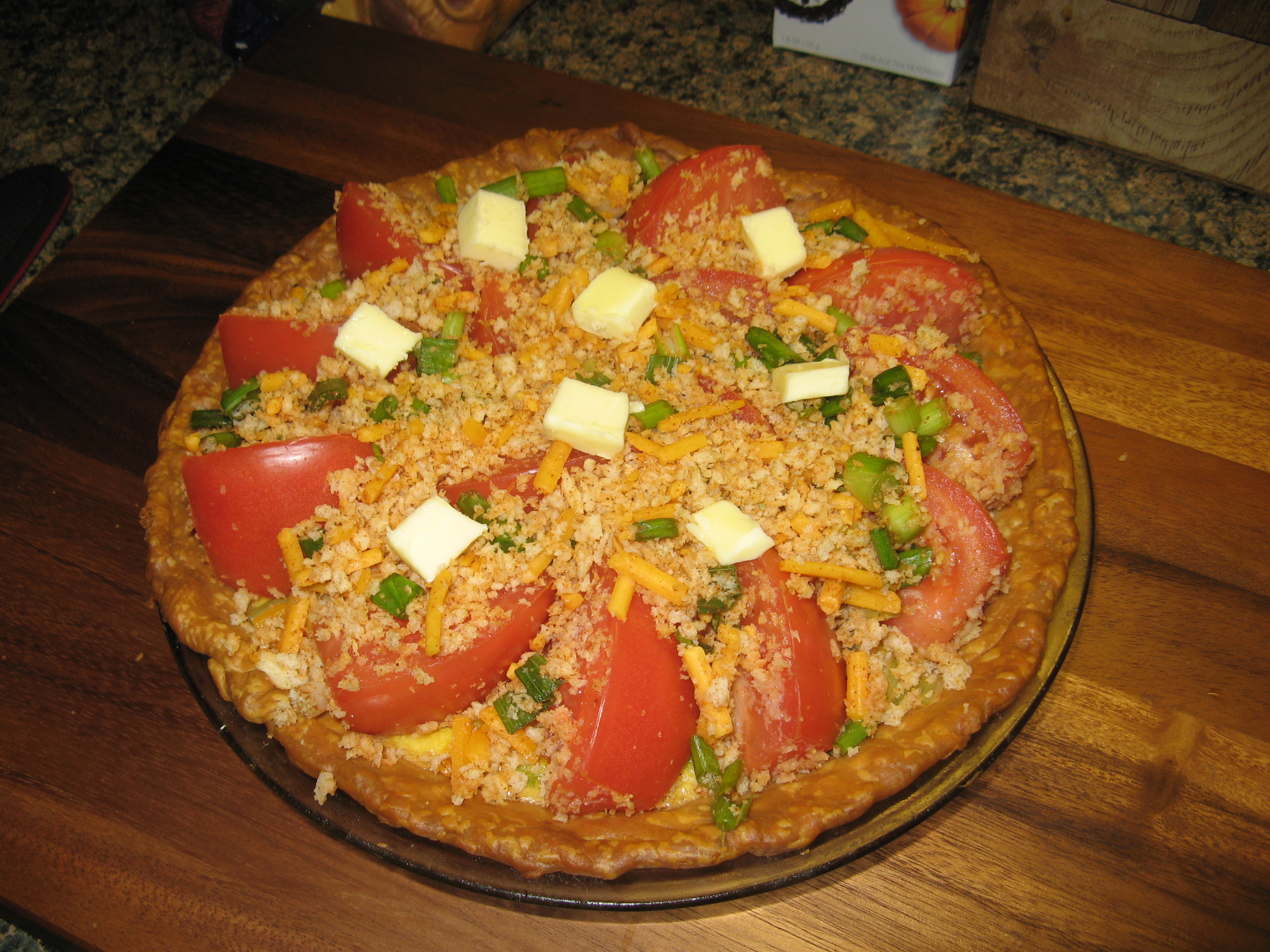 And then topped the pie with the reserved mixture and placed the coated tomatoes on top of the pie and topped it with the remaining panko mixture left in the bowl. Finally I dotted the top of the pie with a tablespoon of butter.