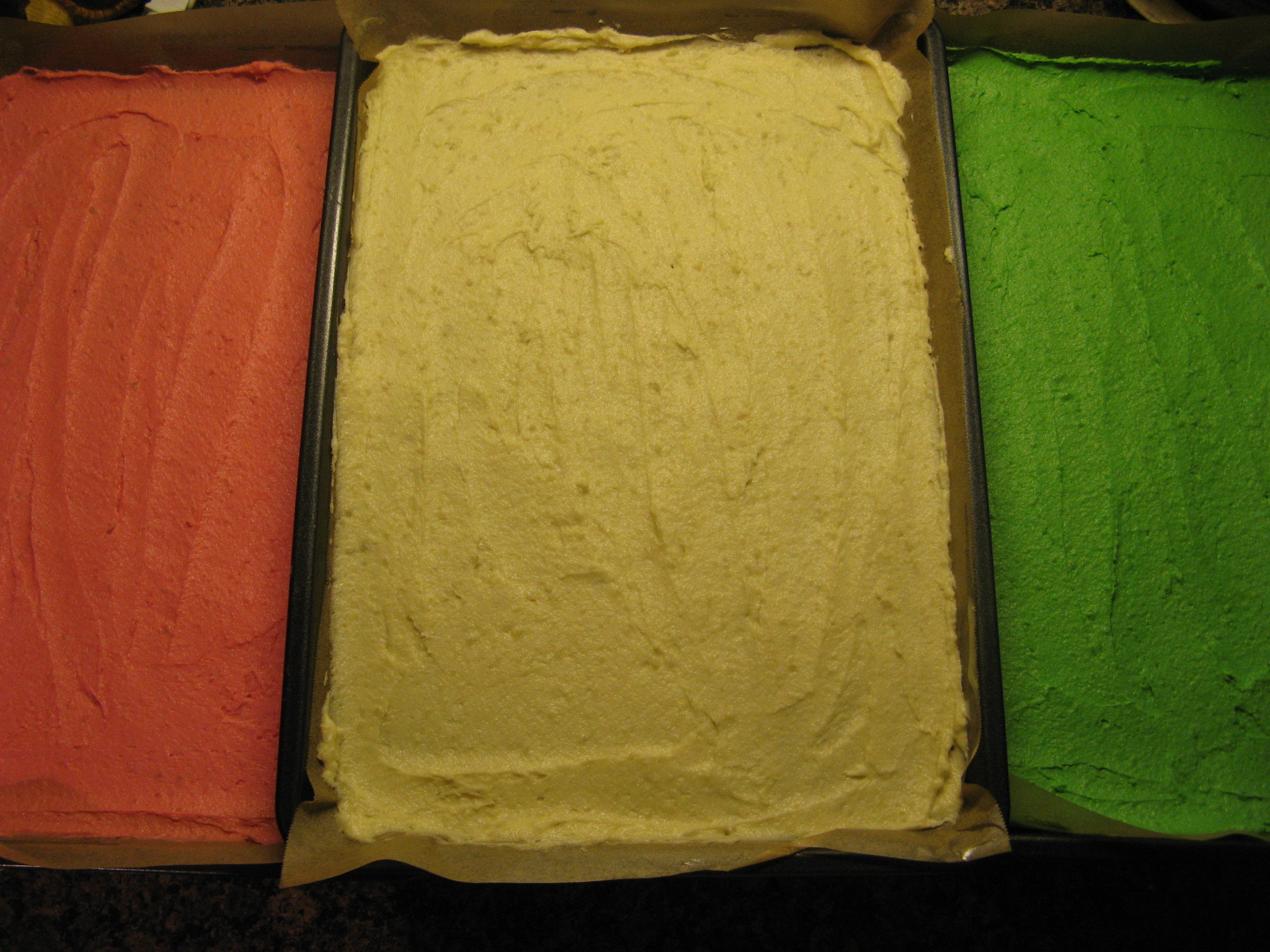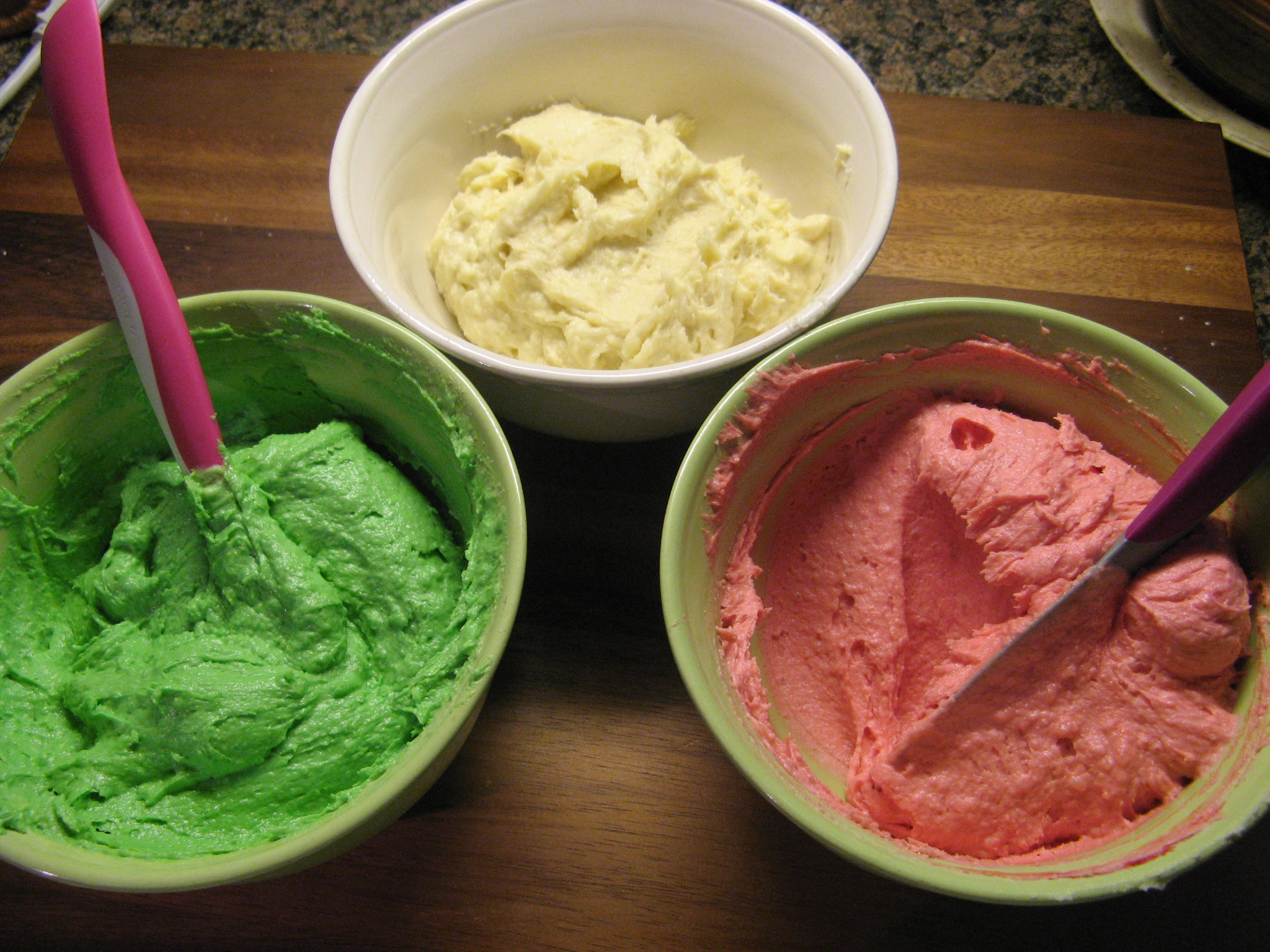 Next I evenly divided the batter among three bowls and tinted one a deep salmon color, another a bright green color and I left the third uncolored.