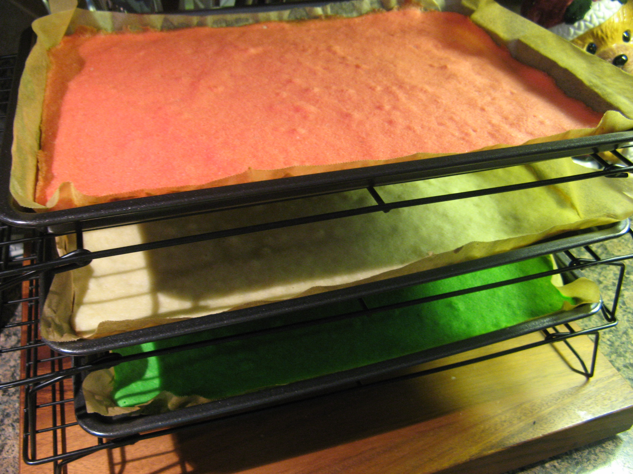 After baking the layers in a 350 F oven for about 10 minutes I let them cool completely in the pans on wire racks.