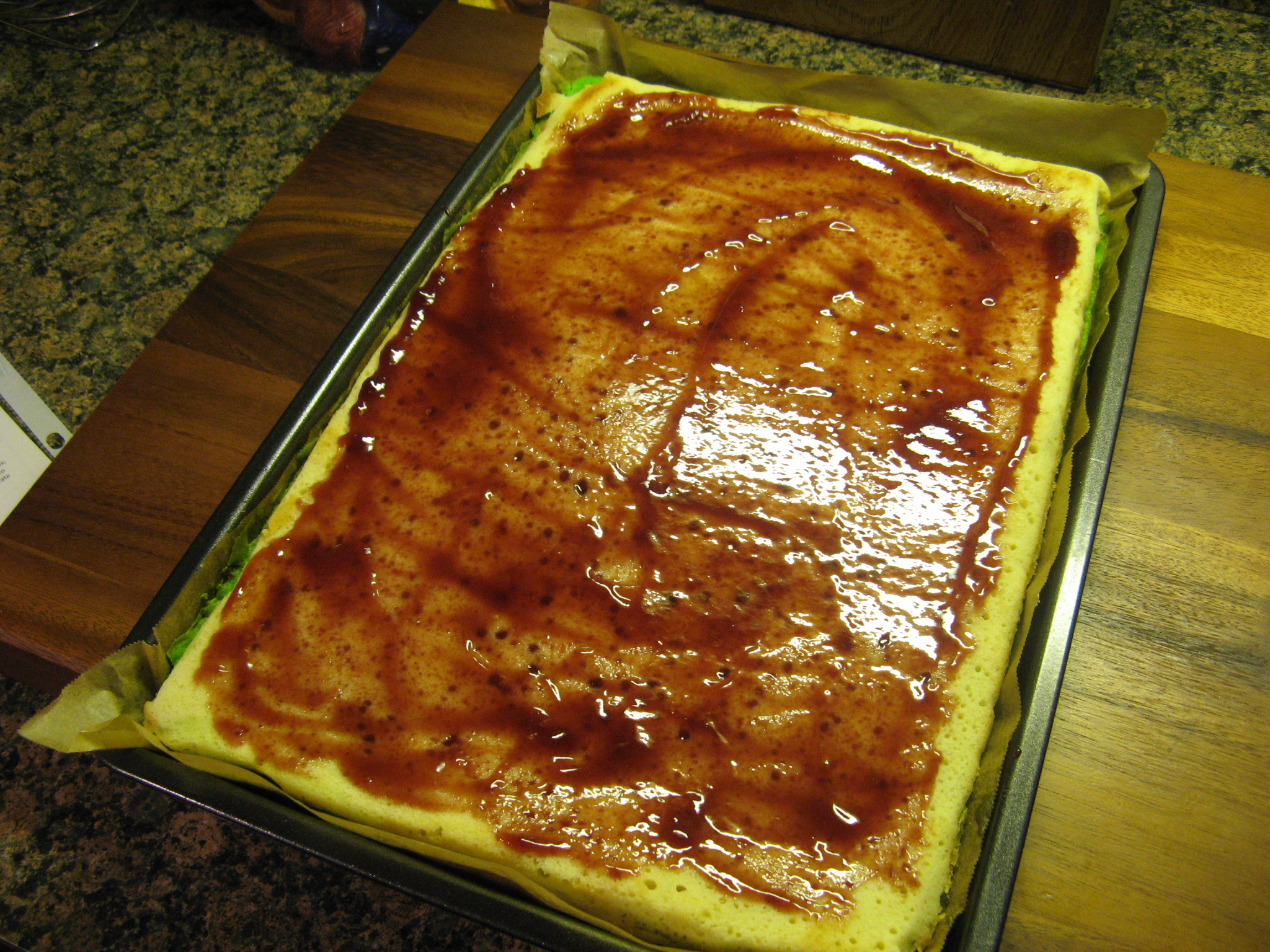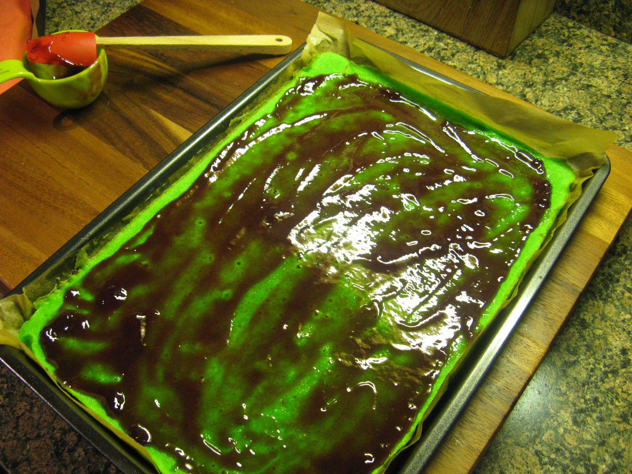 Assemble the layers: Spread half of the jam evenly over the green cake layer almost all the way to the edges. Unmold the plain cake layer by inverting it onto another pan or cutting board; peel off the parchment.