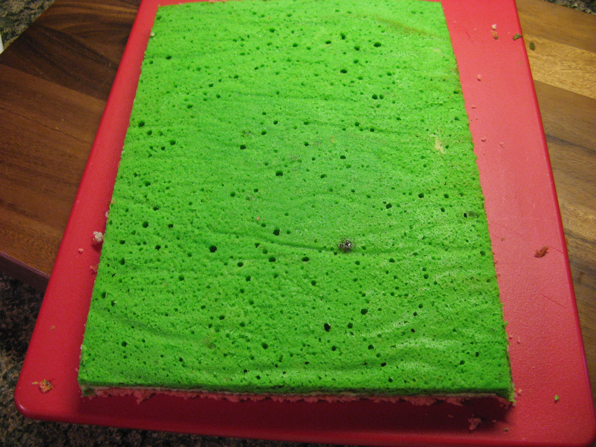 Carefully slide the plain layer onto the green layer (use a wide offset spatula to help you, if necessary). Spread the remaining jam on top of the plain layer. Unmold the red cake layer and slide it onto the plain layer.