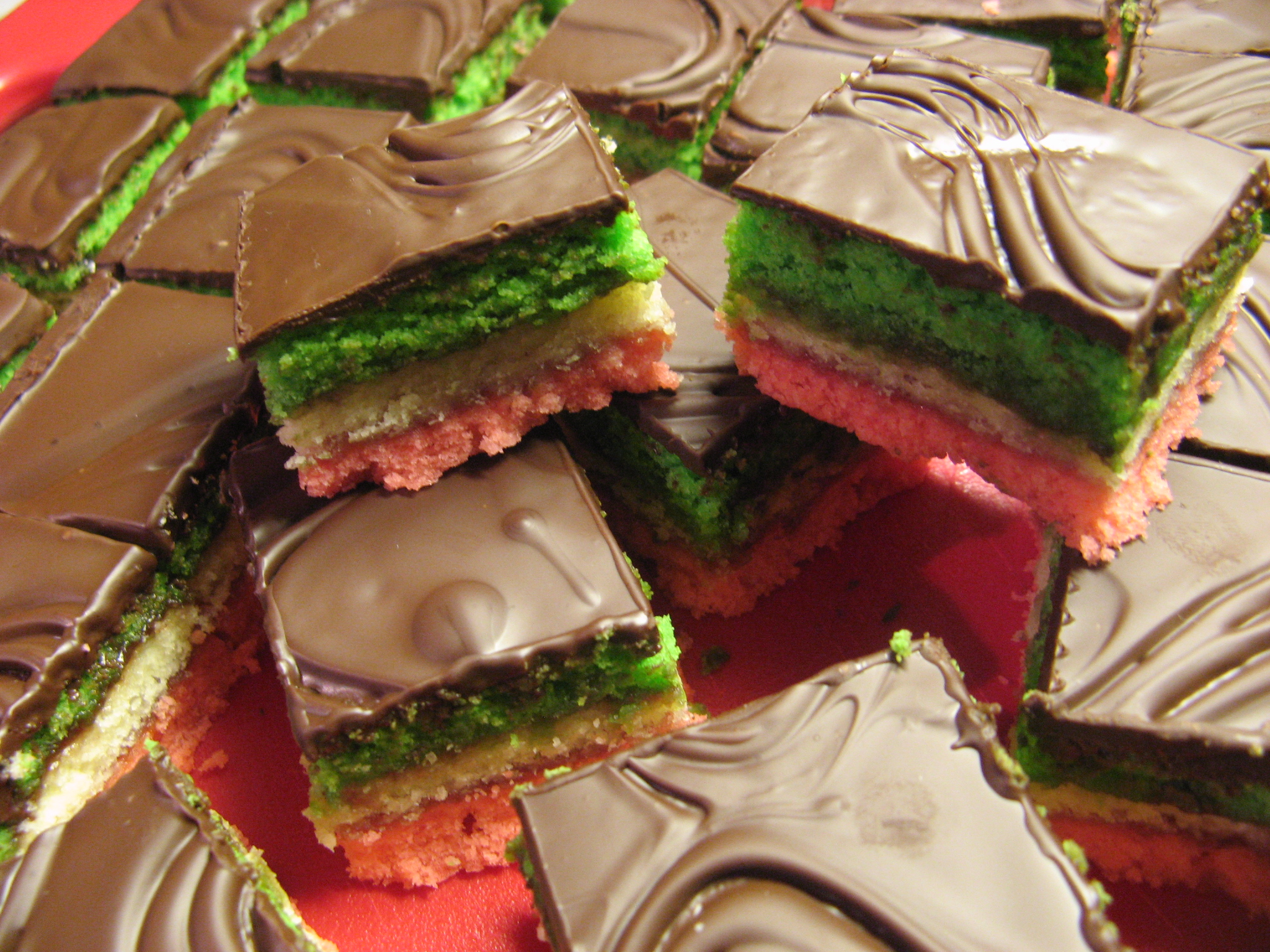Christmas week is finally here and holiday baking is more than likely in high gear for most of you. I know I have quite a few different cookies to bake over the next few days. I was already busy last week trying out some recipes. One of those recipes is actually one that I have tried twice before without much success, but luckily I didn’t strike out with this third attempt. These Rainbow Cookies came out perfect and were well worth the time and numerous steps it took to make them! I’m not sure what exactly led to my success this time, maybe it was the jelly roll pans I used as opposed to the baking dishes or rimmed cookie sheets I used in the past, or me diligently following the recipe exactly as written and reading and re-reading it to make sure I followed it properly or maybe it was just due to sheer patience and dedication. Whichever it was I am just happy to say I finally succeeded in making one of my favorite cookies!