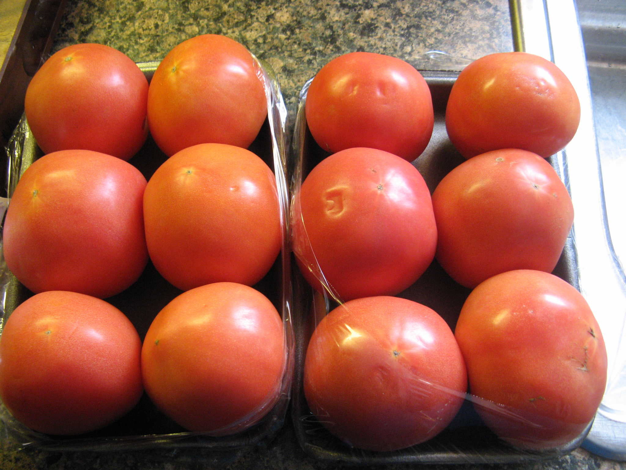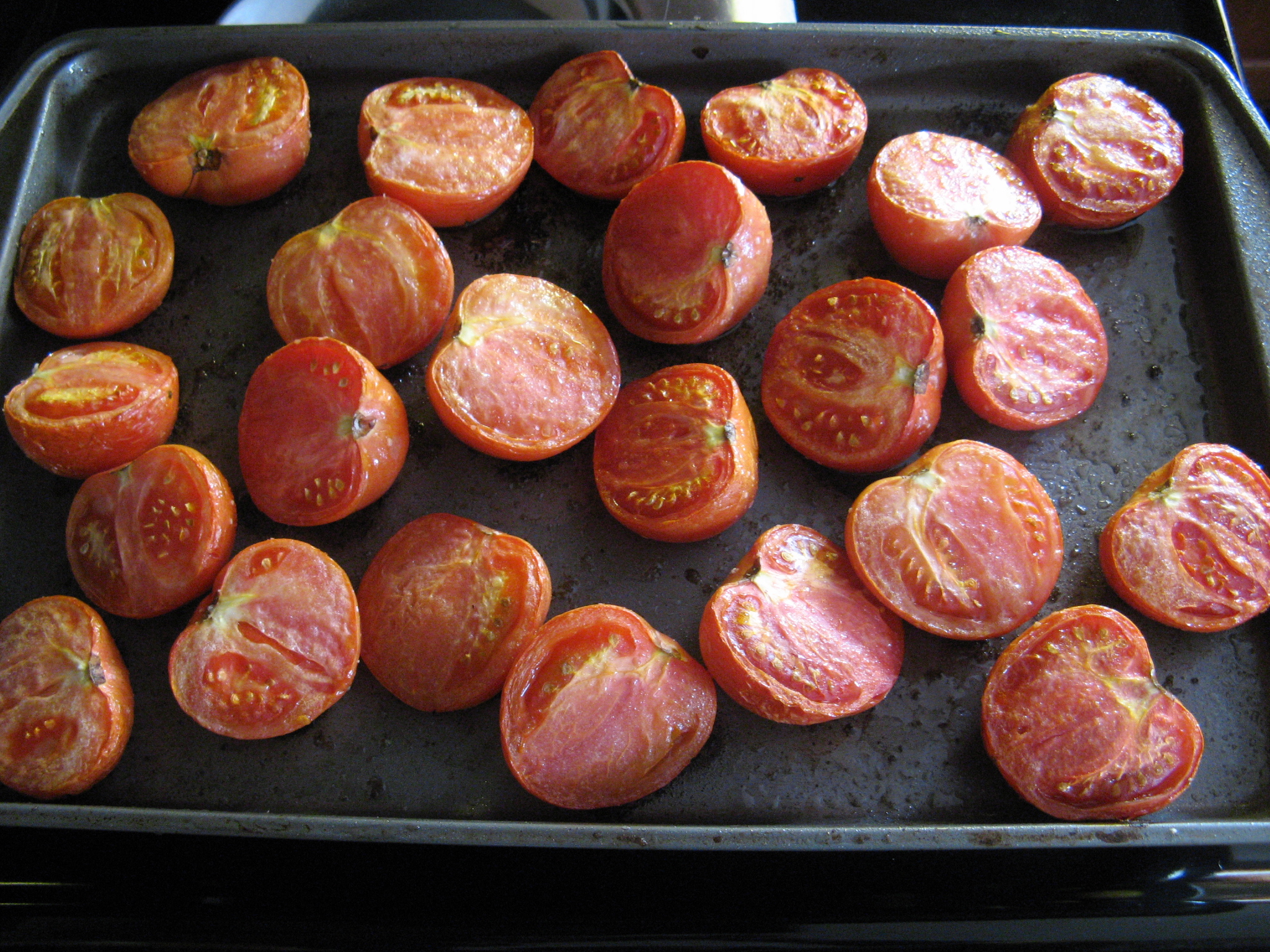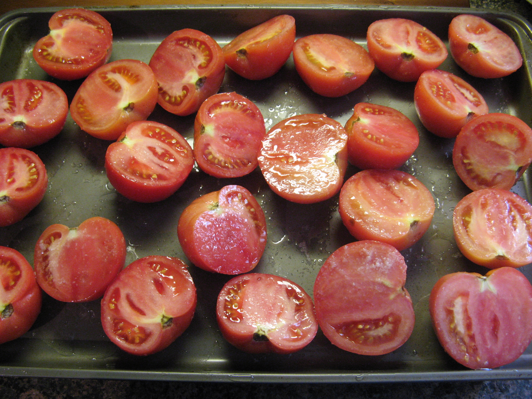 I began by slicing the tomatoes in half and tossing them with olive oil and kosher salt and placing them on a baking sheet.