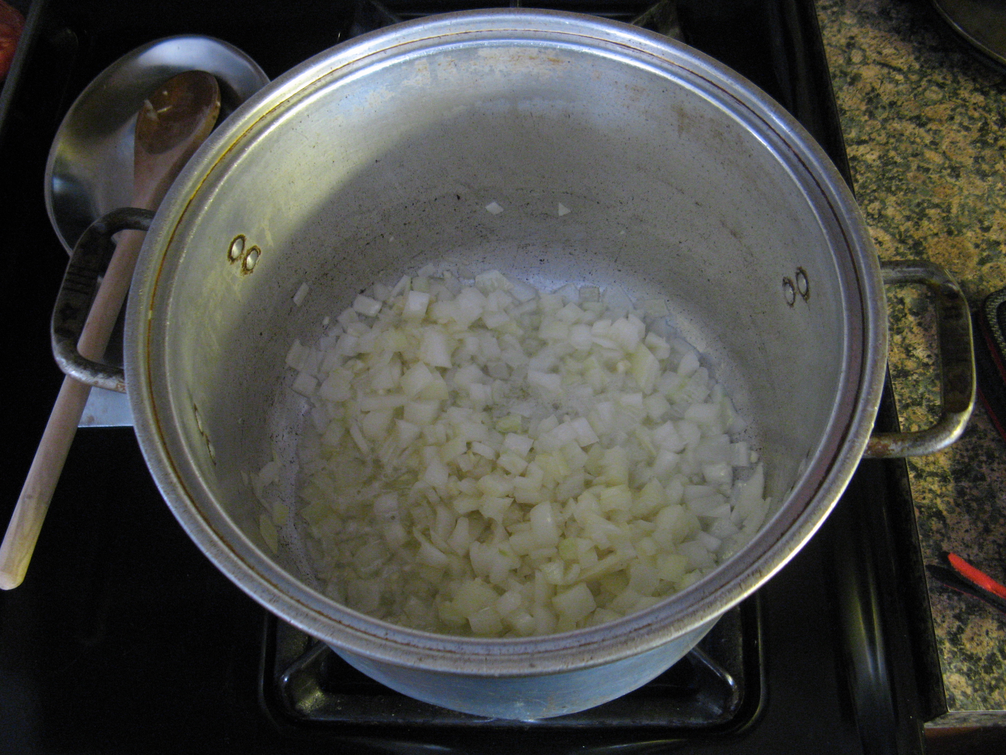 While the tomatoes cooled I chopped two yellow onions and minced four garlic cloves and sautéed both in two tablespoons each of unsalted butter and olive oil over medium heat. The smell of sautéing onions and garlic is probably one of my favorite aromas when it comes to cooking.
