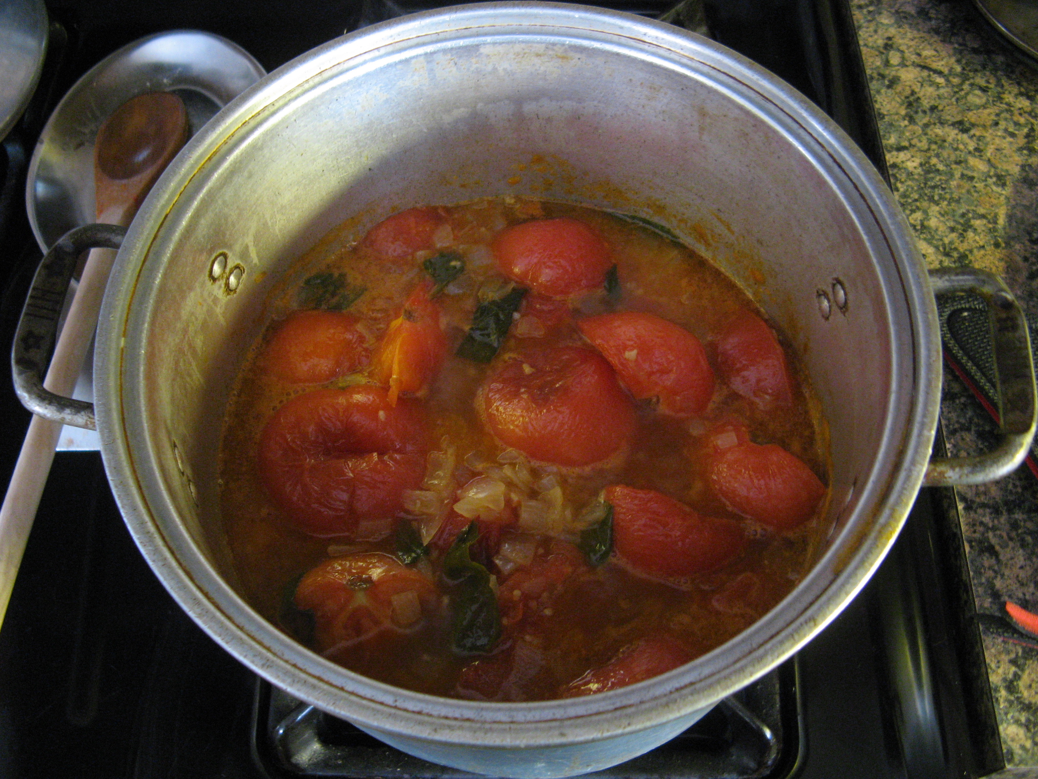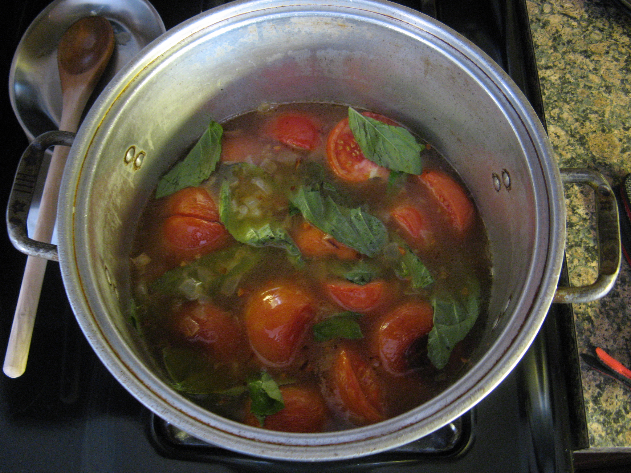 Following that I added a quart of vegetable broth – I used College Inn’s Garden Vegetable Broth – the tomatoes and ten large basil leaves to the onion mixture.