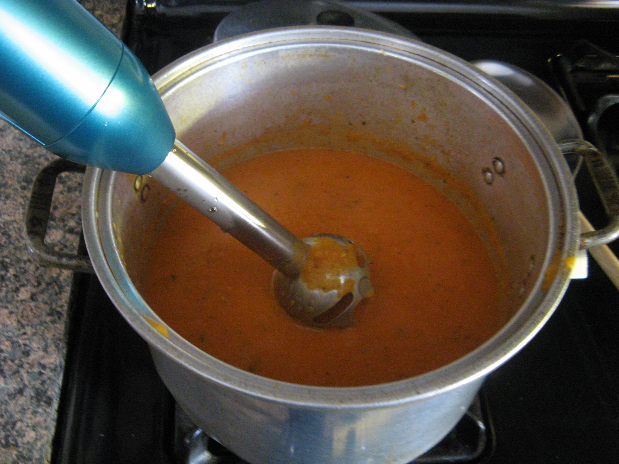 4. Blend the soup with an immersion blender, or blend in a blender or a food processor, until the soup is creamy and all of the tomatoes have been blended. Season with salt and pepper.