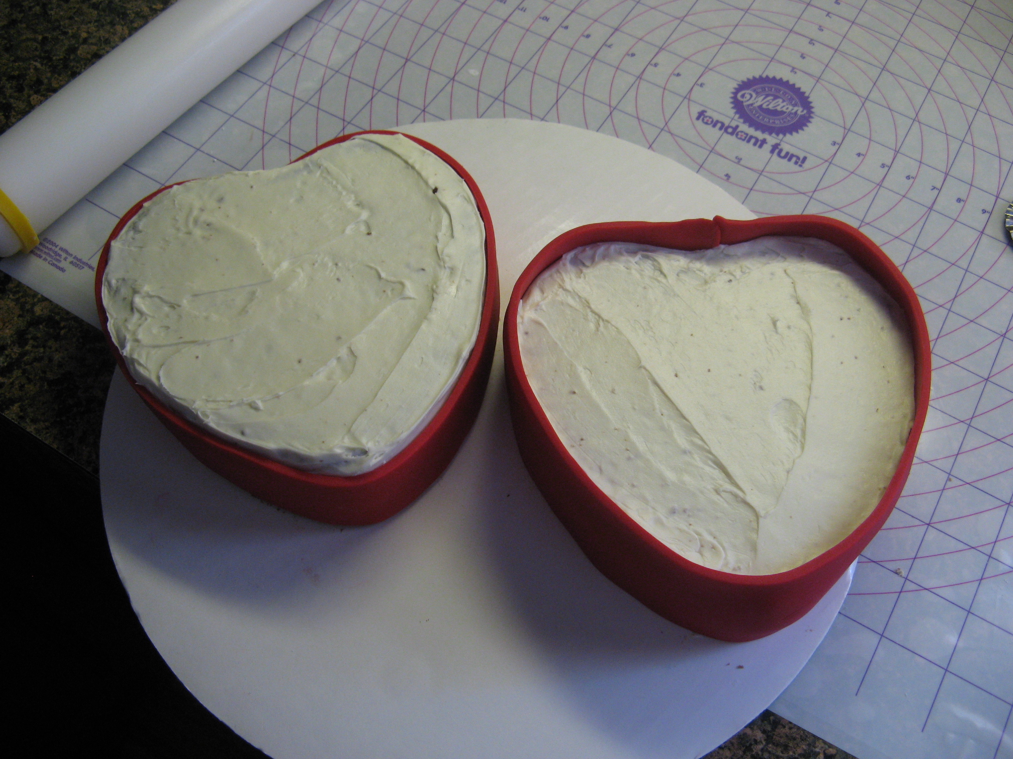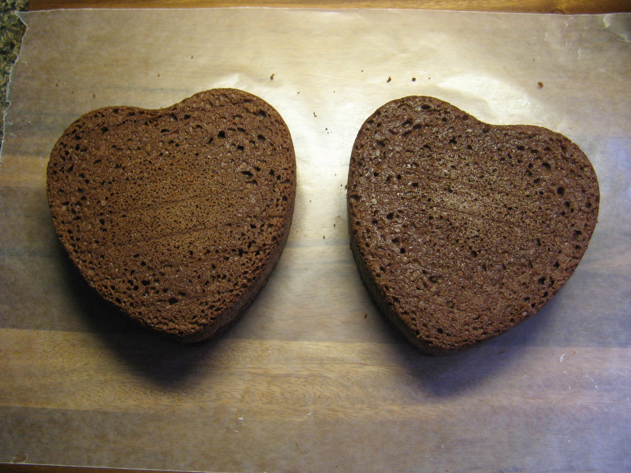 Using one milk chocolate box cake mix I baked two heart cakes filling the pan with about 2 cups of batter for each of the cakes. After letting the cakes cool completely I leveled the cakes using a large serrated knife. I used to use a cake leveler but have found that using a knife allows me to level the cakes more evenly.