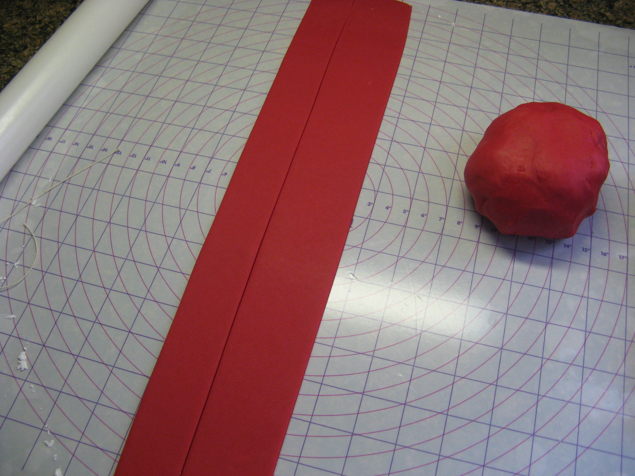 After rolling the red fondant out to an 1/8 of an inch thick I cut two strips of fondant long enough to wrap around each of the heart cakes, one an inch and half wide – the height of the cake – for the top of the candy box and the other two inches wide for the candy box.
