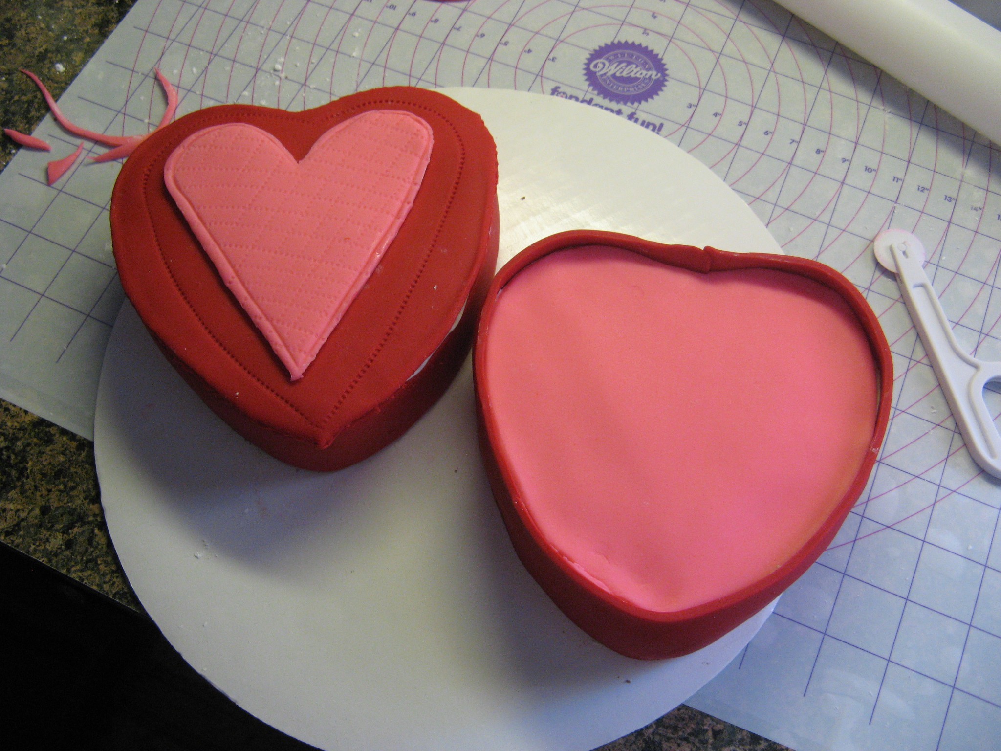 Once I was done with the red fondant I rolled out the pink fondant and cut out two hearts – one smaller than the red cover I previously cut and one to fit inside of the wider red border – the candy box cake. On the smaller of the two pink hearts I used a fondant stitching wheel to etch an angle design.