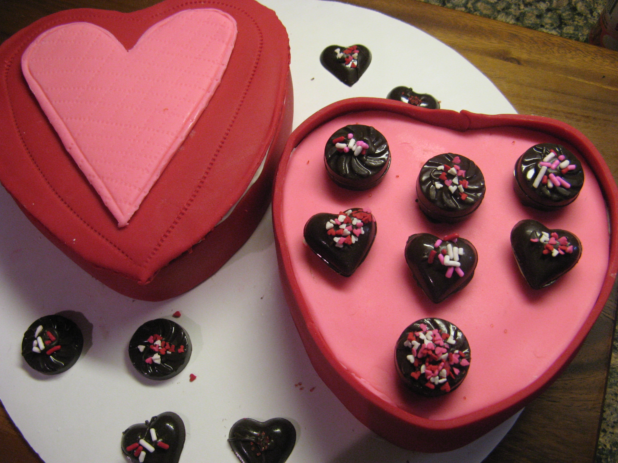 Next I rolled out more of the red fondant and using my heart cake pan as a template, I traced out a heart for the cover of the candy box.