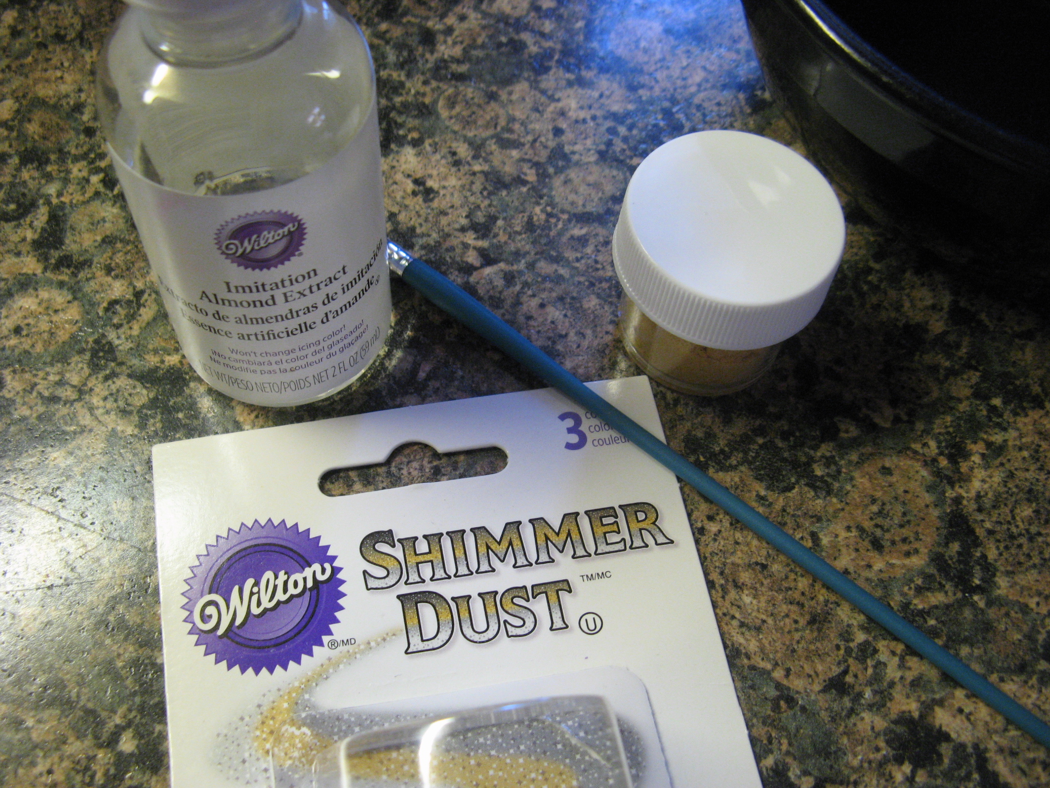 On the original cake the edges were painted gold using gold dust and extract. I attempted to do the same with shimmer powder I had on hand…