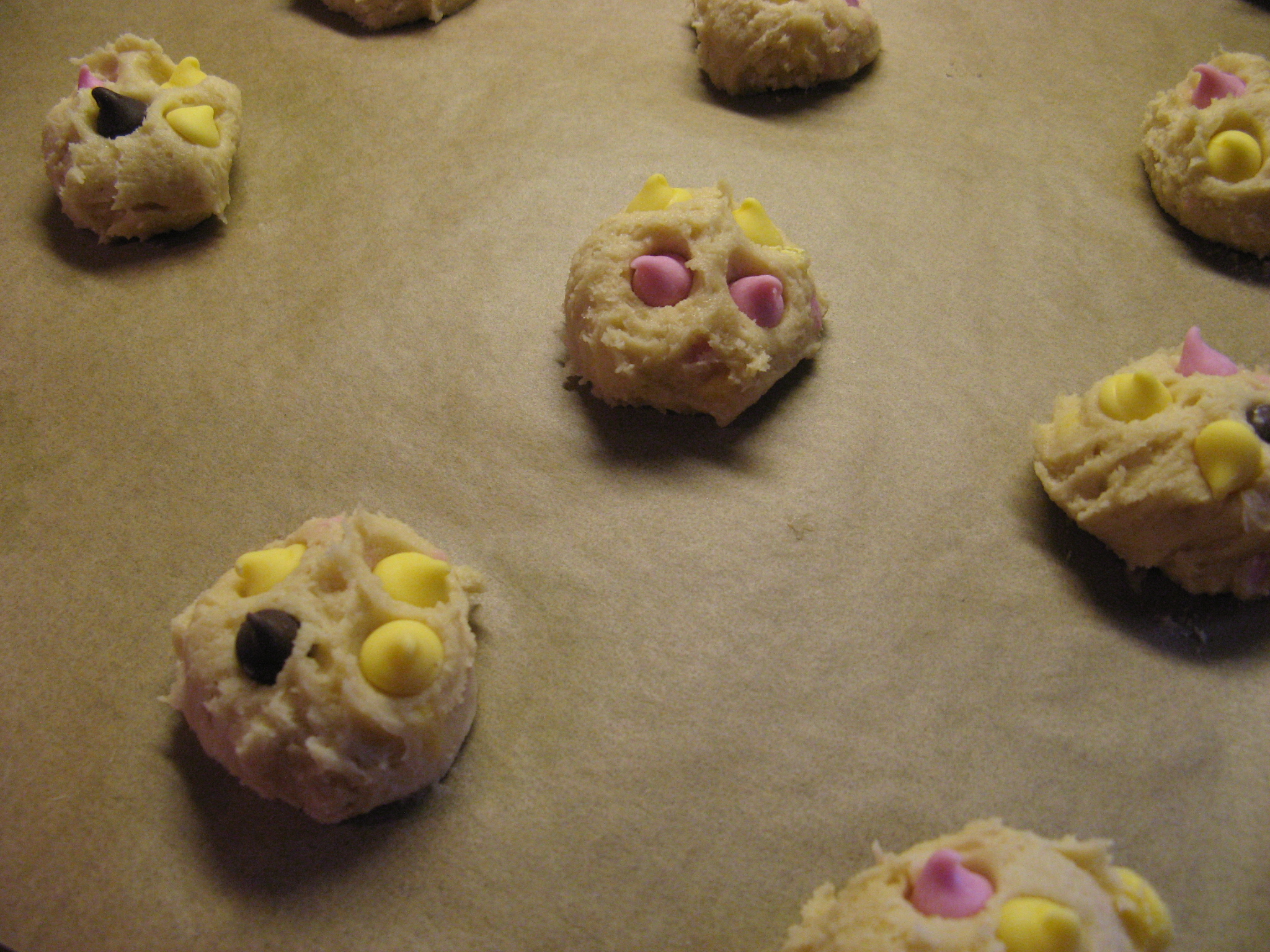 After making the dough for the cookies – I combined flour, baking soda and salt in one bowl and then slowly added that to a mixture of butter, granulated and brown sugars, eggs and vanilla extract which I mixed in a stand mixer and then stirred in a cup of the Spring themed chips – I used a cookie scoop to drop the dough on parchment lined cookie sheets and pressed some extra chips into the cookies and then baked them in a preheat 350 F oven for eleven minutes.