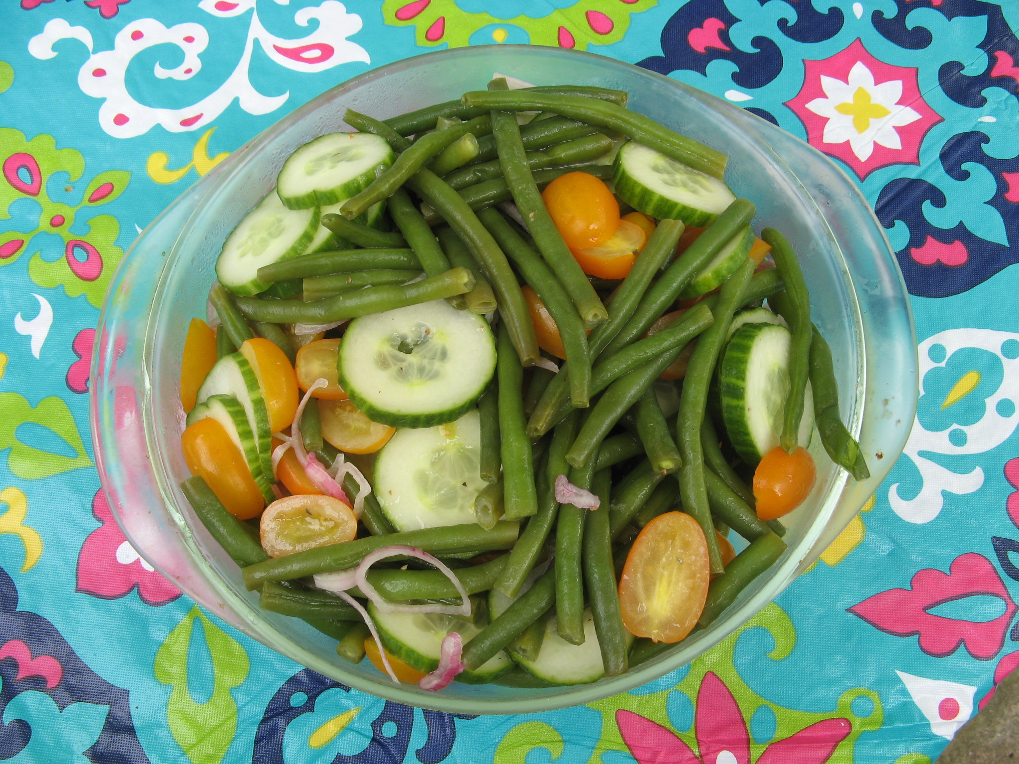 2. In a large bowl toss the green beans along with the remaining ingredients and then season with salt and pepper. Transfer to a serving dish and refrigerate until ready to serve.