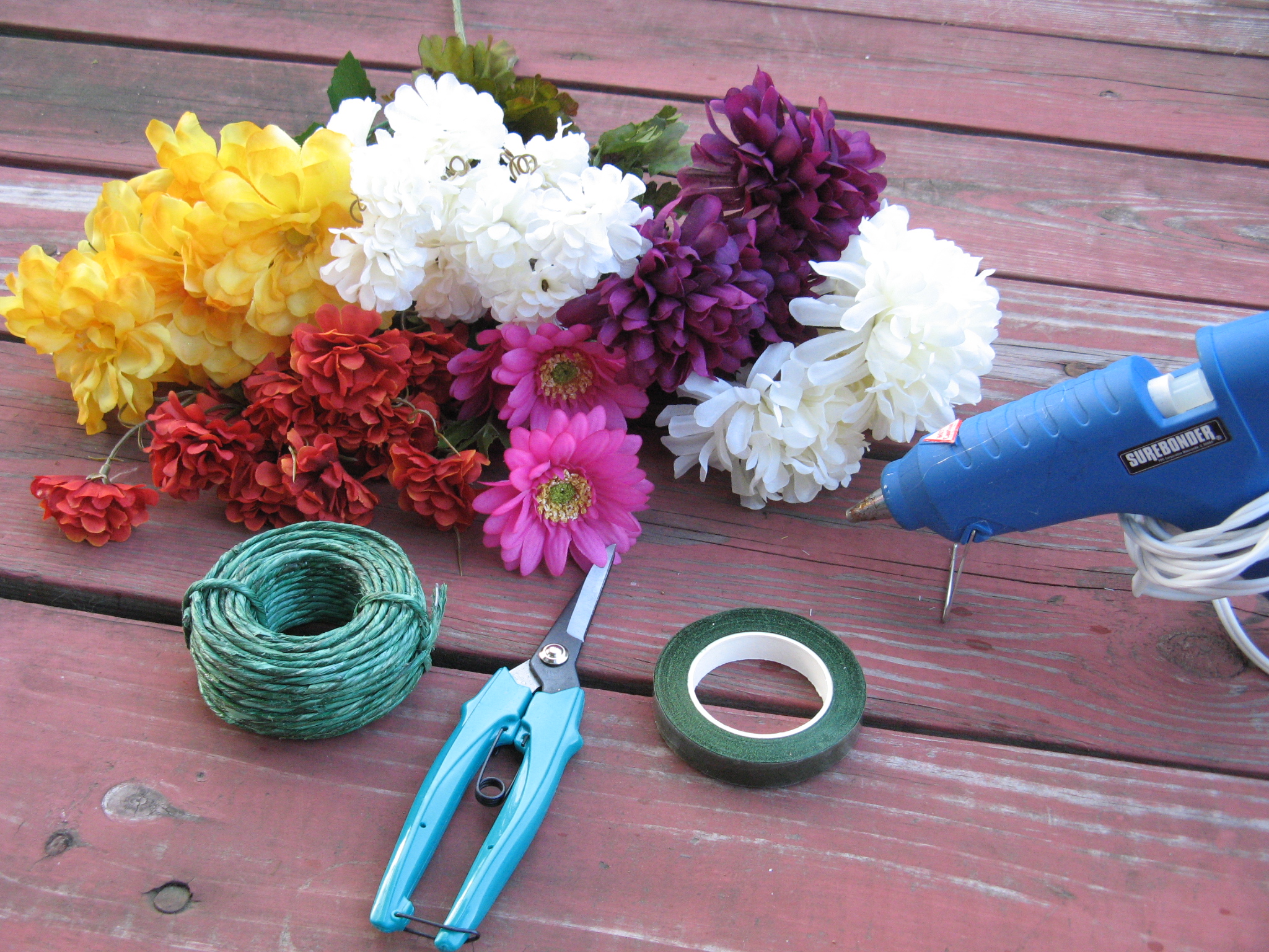 Supplies needed are silk flowers, floral wire and tape, wire shears and a hot glue gun.