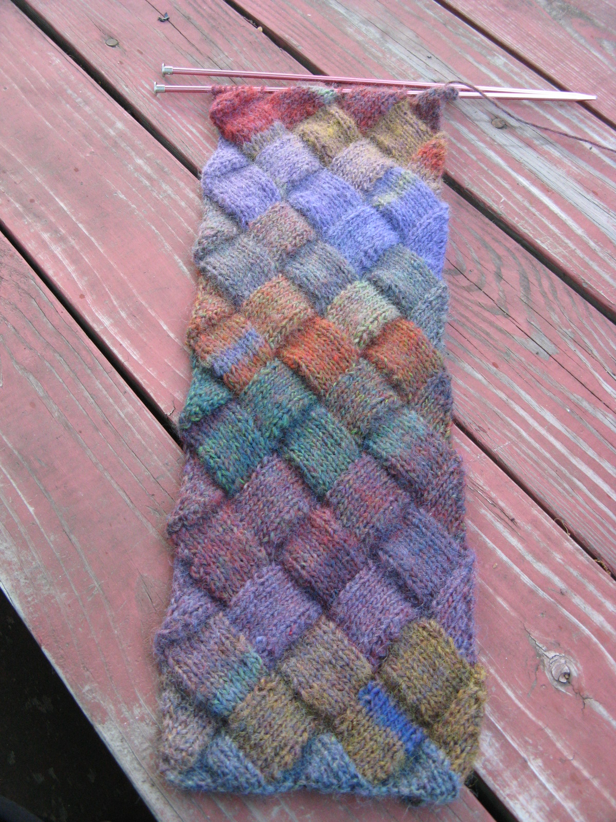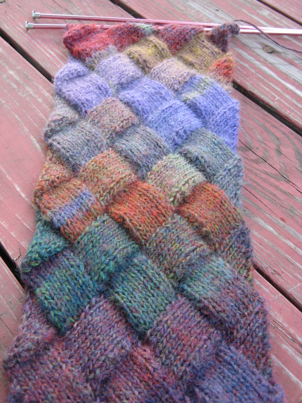 Here’s a close-up shot of it… While it may look as though it’s different strips of yarn woven together it’s the complete opposite, the entire scarf is knitted in one piece with a series of triangles and squares. It sort of reminds me of a basketweave pattern, but, on an angle. Using yarn such as this one – Lion Brand’s Amazing – really helps one to appreciate the pattern because of the color variations.
