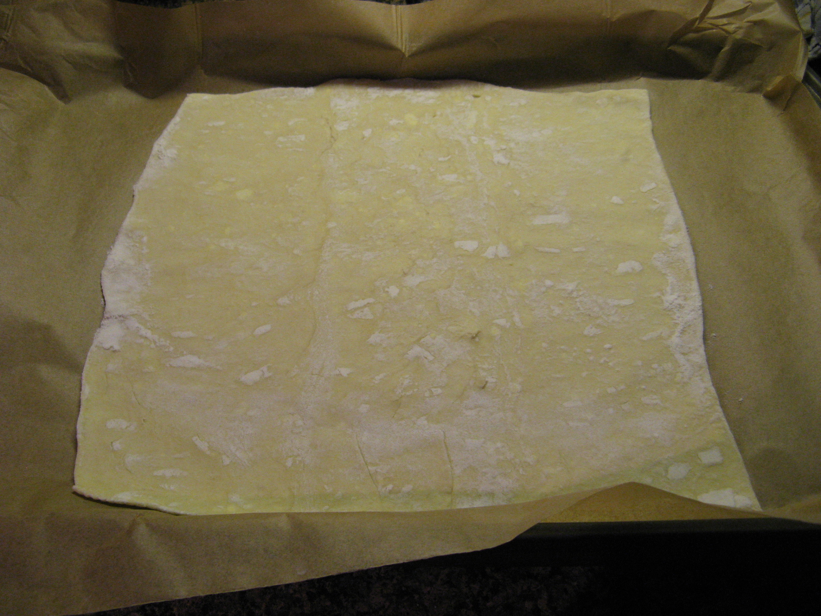 While you could make your dough from scratch, I opted to go the easier and quicker route by using a puff pastry sheet. After thawing the sheet out I rolled it on a lightly floured surface into a 12-inch square. I then transferred it to a parchment lined cookie sheet and placed it the refrigerator for about 20 minutes.