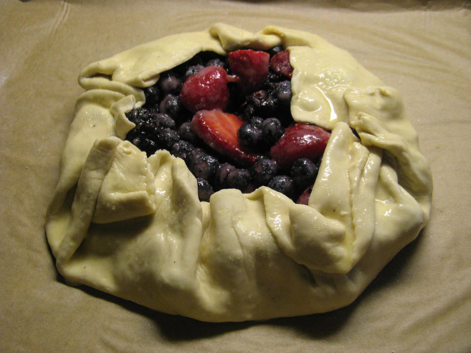 Following that I put my berries – which I tossed with corn starch, sugar and salt – in a small mound in the center of the sheet and folded the edges around it. I brushed the edges with an egg wash – an egg beaten with a teaspoon of water – and sprinkled granulated sugar on it.