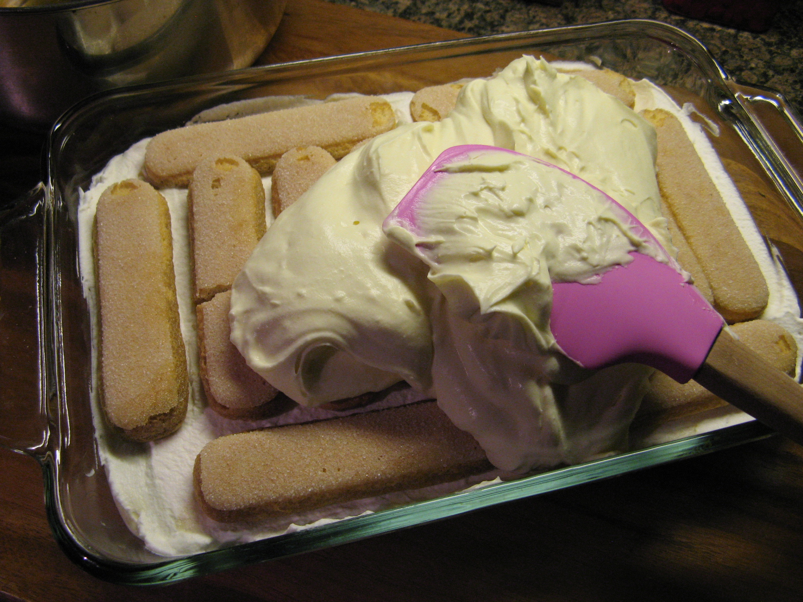 Using an 8 x 11 inch dish I made the first layer of the tiramisu and then topped it with another. After arranging ladyfingers that I soaked in the coffee and Kahlua mixture I topped it with the mascarpone mixture…