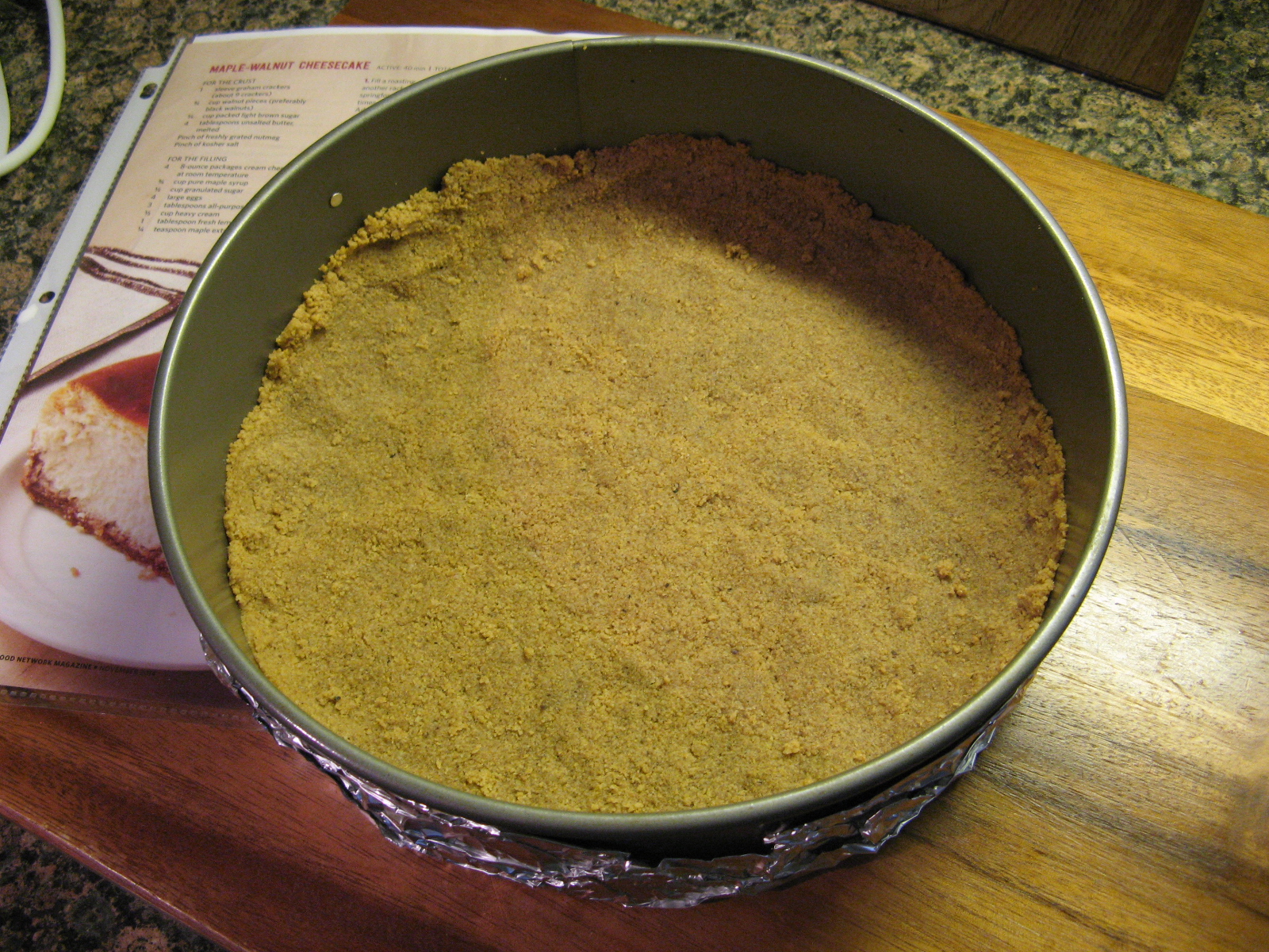 I began by making the crust. I pulsed a sleeve of graham crackers – 9 crackers – in my food processor until they were crushed. I then added in walnuts and brown sugar and continued pulsing the mixture until it was finely ground. Finally I added in melted butter, salt and nutmeg and continued pulsing the mixture until it was combined. Following that I pressed it into the bottom and about an inch up the side of a 9-inch springform pan that I wrapped with aluminum foil. I then baked it in the middle rack of a preheated 350 F oven. On the lower rack of the oven I placed a roasting rack filled halfway with water. Once the crust was light golden, about 10 minutes, I transferred the crust to a wire rack to cool. Once it was cool it was time to make the filling…