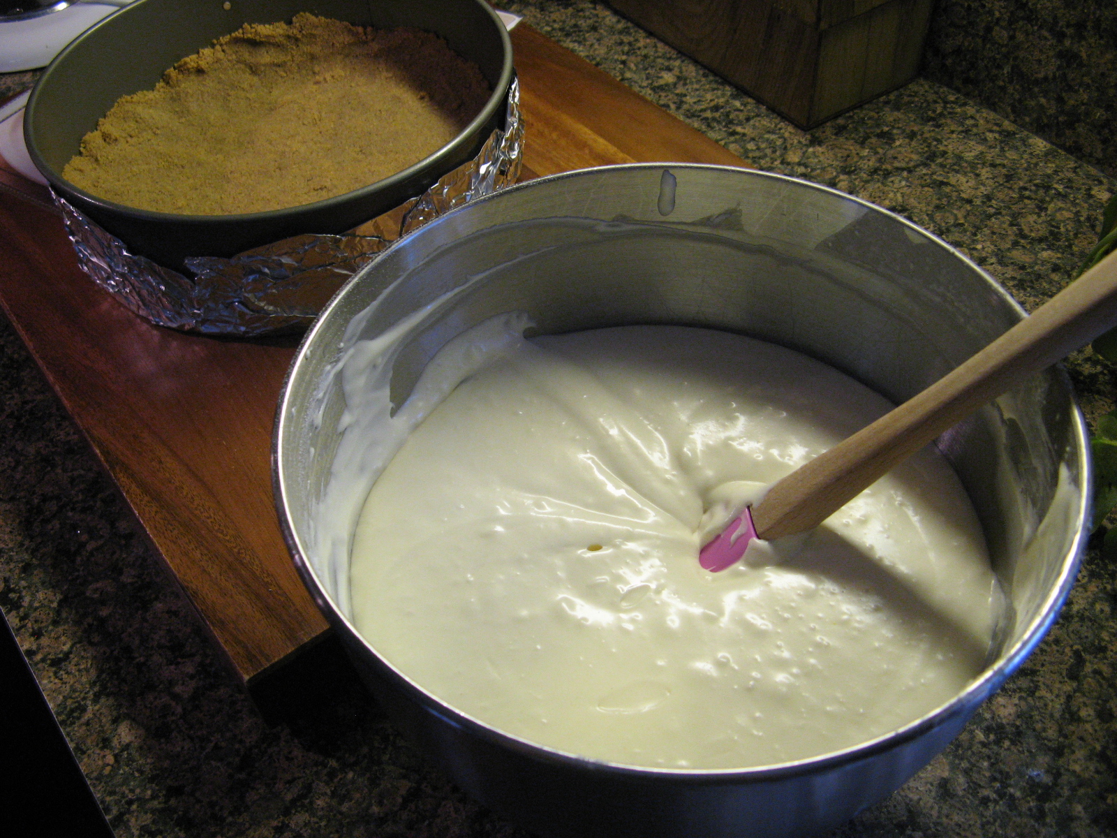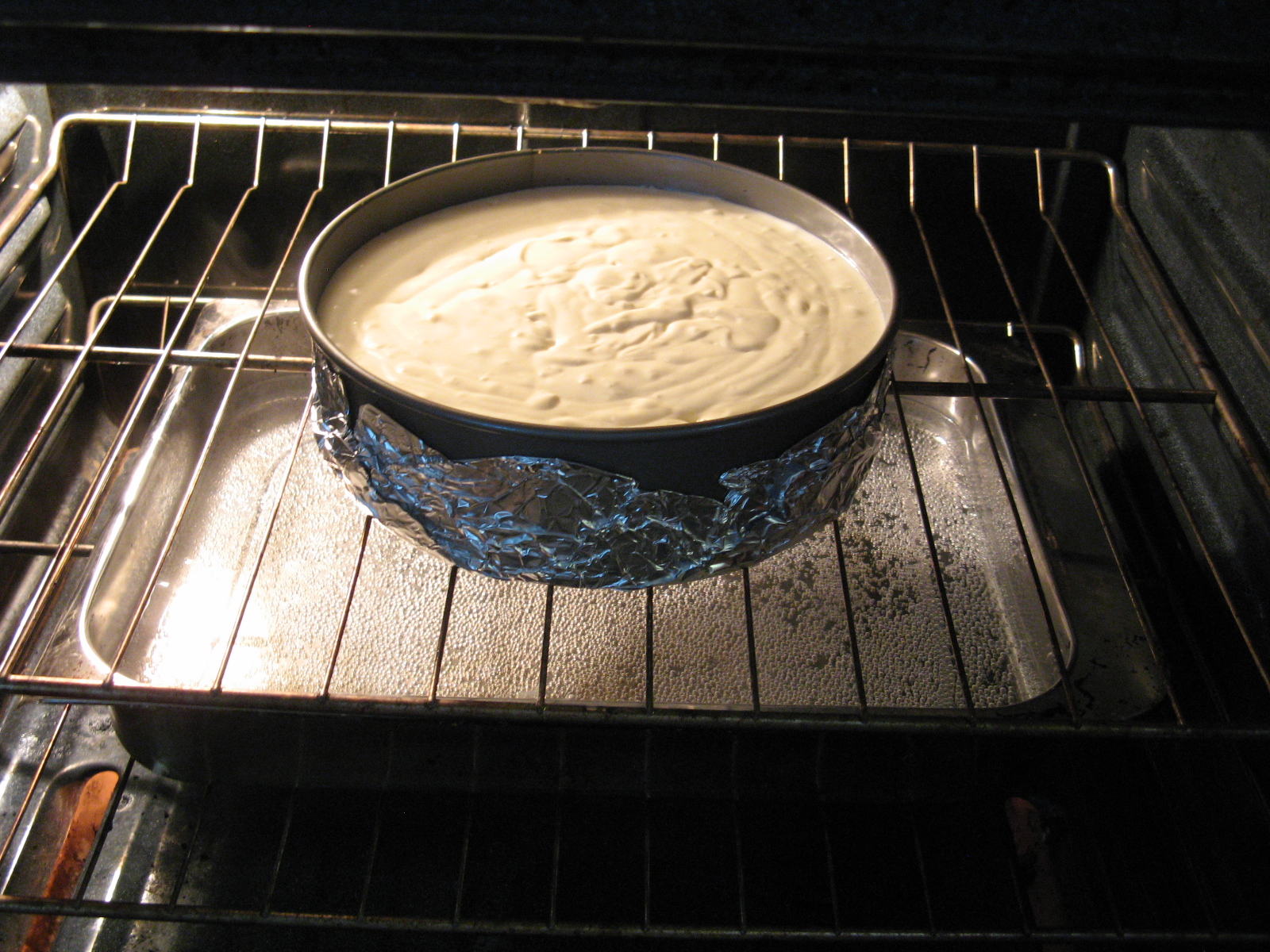 Once the filling was ready I poured it into the cooled crust and then placed the cheesecake in the oven directly over the roasting pan with water.