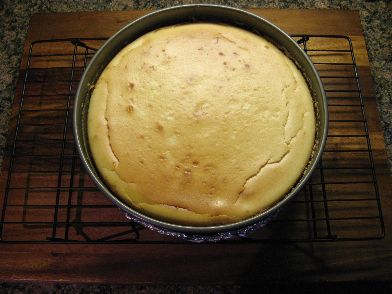 After baking for about an hour I transferred the cheesecake to a wire rack to cool to room temperature. I knew it was ready because it was set around the edges but slightly jiggly in the middle. After it cooled I covered it with aluminum foil and refrigerated it overnight.