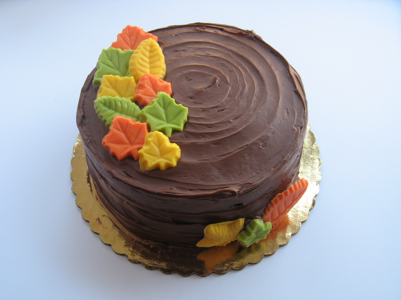 And finally, the Chocolate Cake. The cake had a pumpkin spice mousse filling – it was super simple to make and delish thanks to a box of Jell-O Pumpkin Spice Pudding mix – and frosted it with chocolate frosting. And to give it a Fall theme I topped it with white chocolate leaves in seasonal colors.