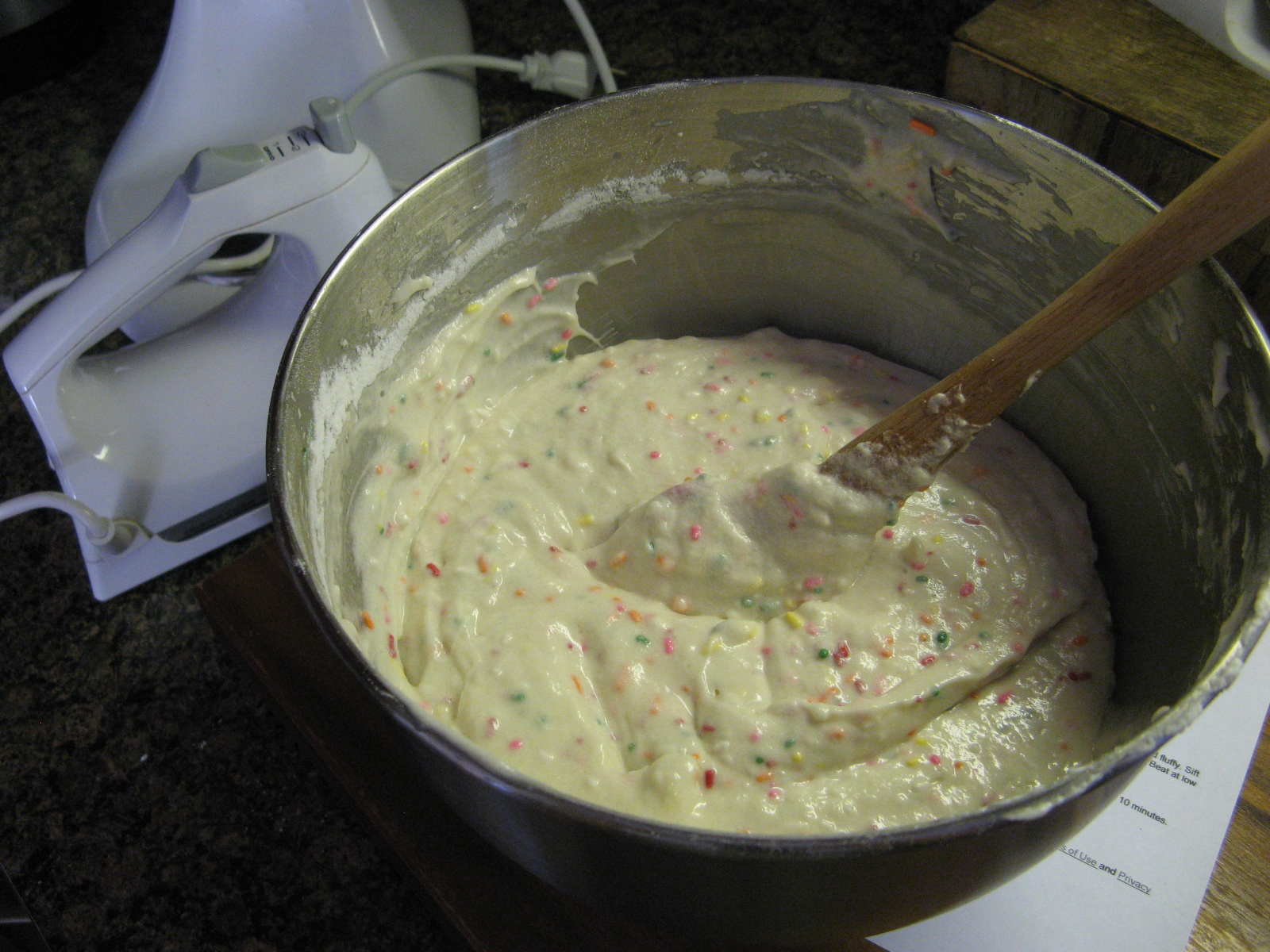 Gently fold in the egg whites and sprinkles and then divide the batter among the 3 pans.