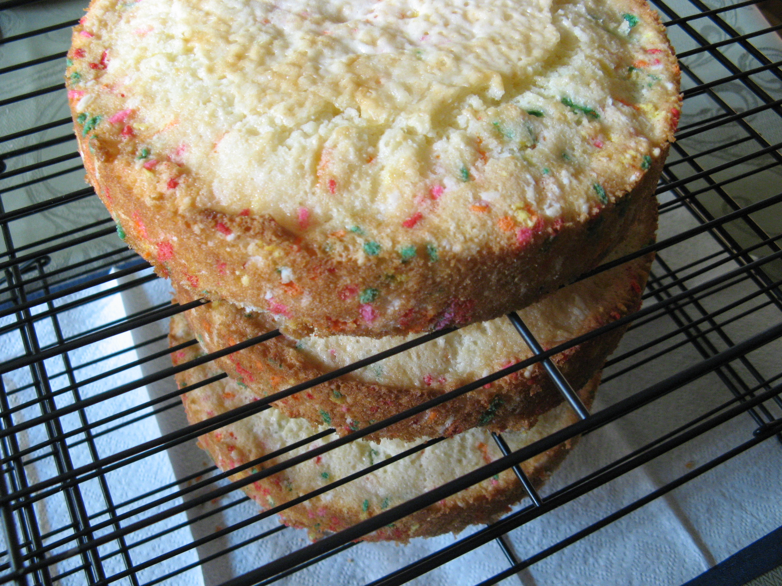 I divided the batter among 3 8-inch round cake pans that I sprayed with baking spray and then baked them in a 350 F oven for about 25 minutes. After letting the cakes cool in the pans for about 10 minutes I then turned the cakes out on wire racks so they could cool completely.