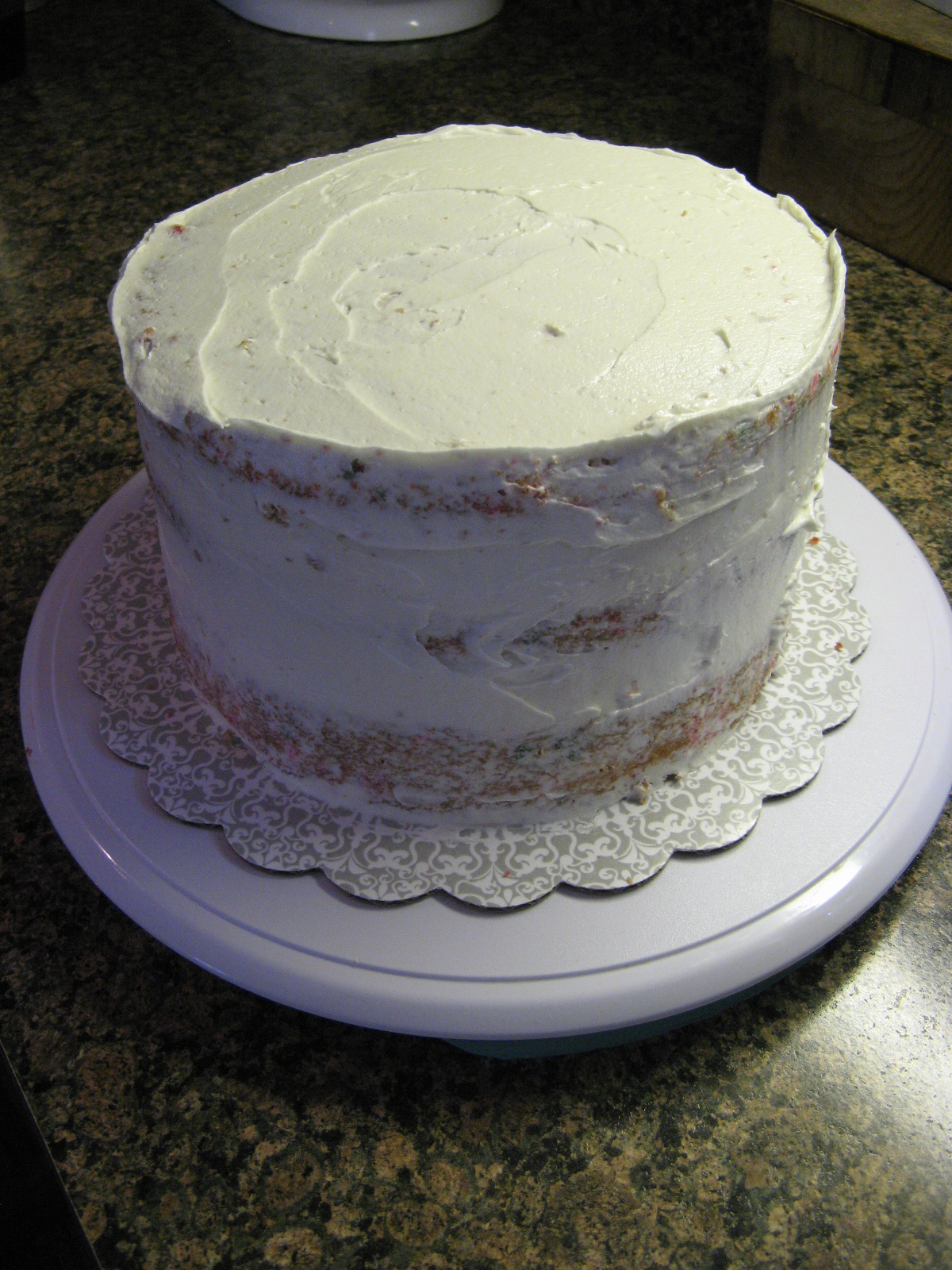 I then made my go-to frosting, a Fluffy Vanilla Frosting from Martha Stewart. After crumb coating the cake…