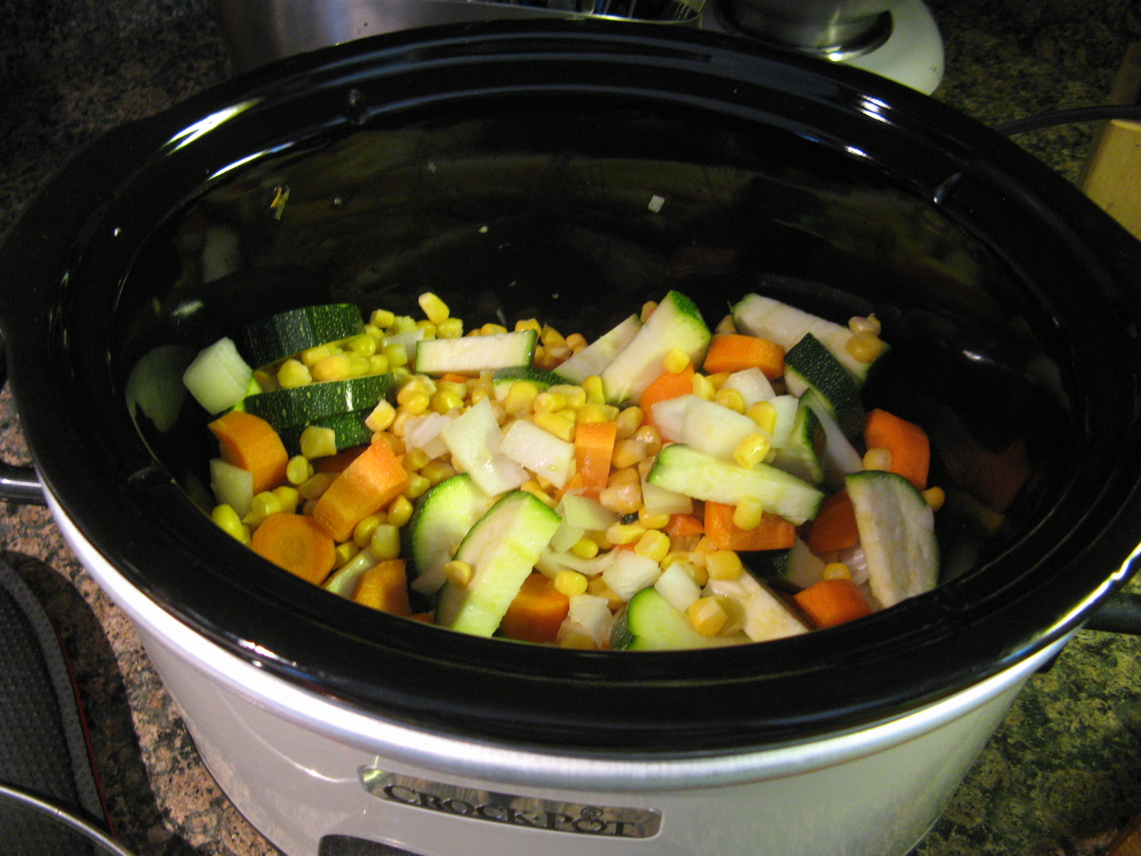 I began by adding all of my vegetables to my slow cooker: corn, chopped onion, chopped carrots, sliced zucchini and garlic. I wasn’t sure if garlic could be considered a vegetable, but, adter a little research it turns out it can be.