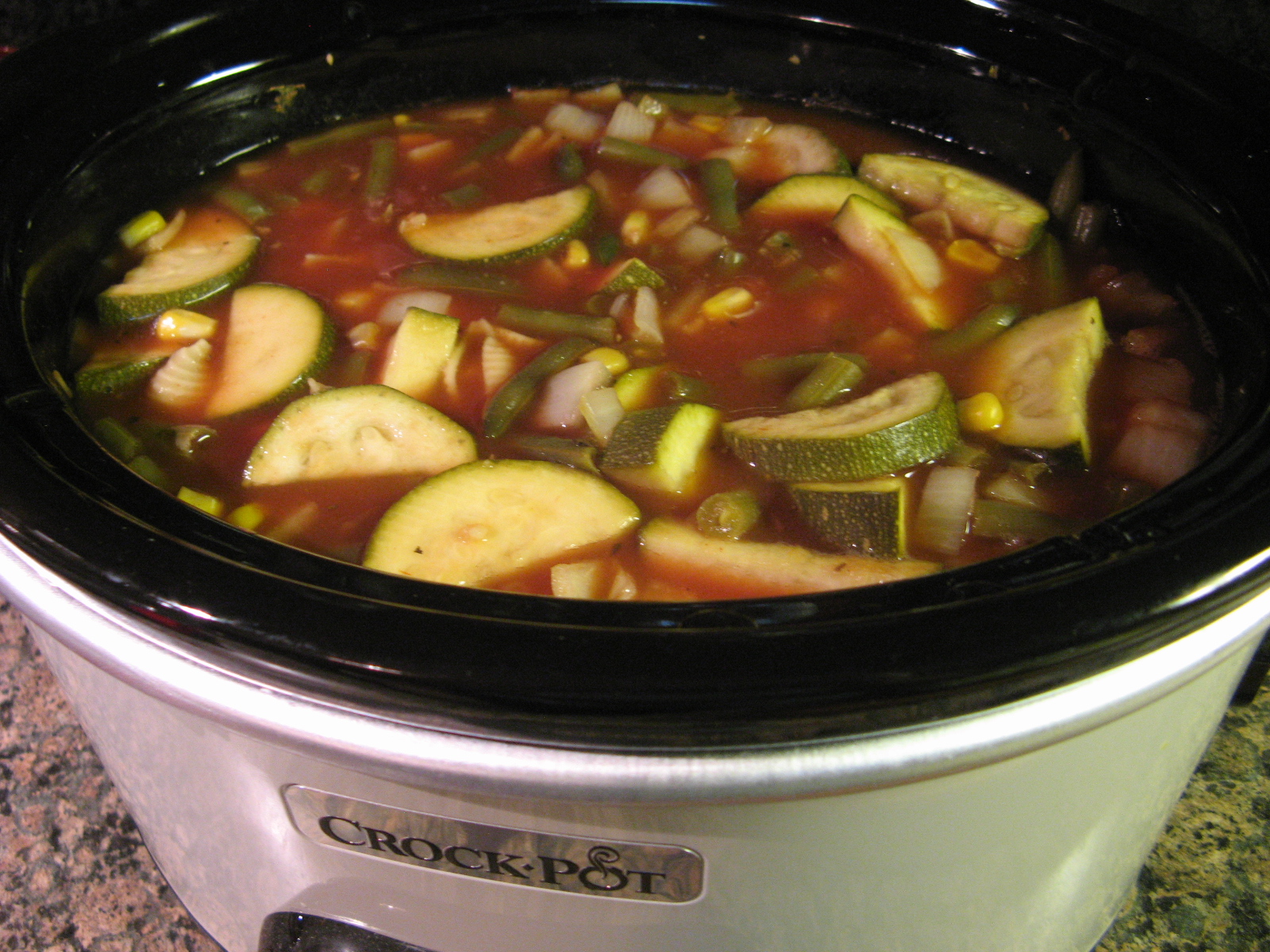 Ingredients: 1 10-ounce package frozen whole kernel corn 1 cup chopped onion 1 cup chopped carrots 1 small zucchini, sliced into half moons 2 garlic cloves, minced 6 cups low sodium vegetable or chicken broth 1 6-ounce can tomato paste blended with basil, garlic and oregano 1/2 teaspoon salt 1/2 teaspoon dried basil 1 9-ounce package frozen green beans 1 cup dried small shell macaroni Shredded parmesan cheese, for topping Directions: In a 3 1/2 to 5 quart slow clooker combine the frozen corn, onions, carrots, zucchini and garlic. Stir in the broth, salt, basil and tomato paste until the tomato paste is completely blended into the broth. Cover and cook on high for 3 1/2 to 4 hours (or on low for 7 to 8 hours). Add the macaroni and green beans and cook for an additional 45 minutes. Please note, if you cooked the soup on the low setting, set it to high once you add in the macaroni and green beans. Serve in bowls topped with shredded parmesan cheese. Recipe from Better Homes and GardensItalian Vegetable and Pasta Soup