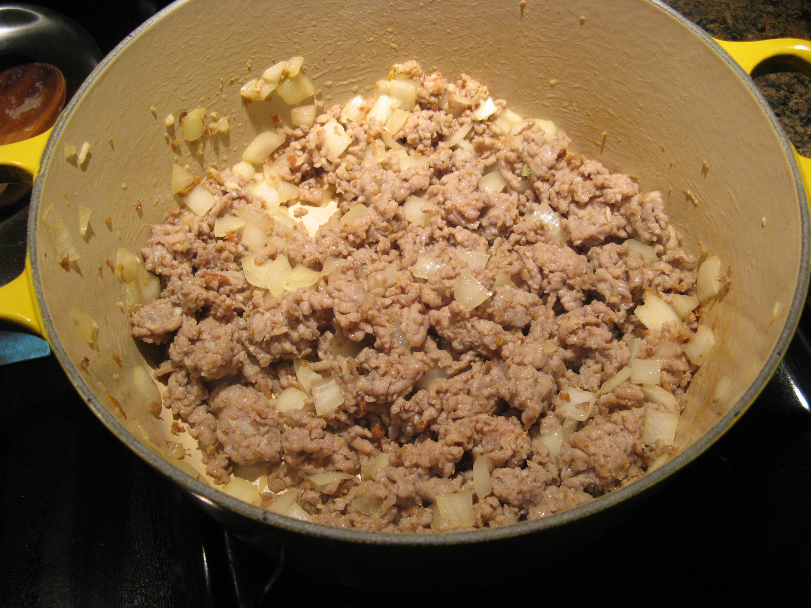 I began by cooking a 1lb. of sweet Italian sausage meat in my Dutch oven over medium-high heat until it was beginning to brown. If you can find sausage meat in ground form as opposed to actual sausages it will save you some time and just make things easier so you don’t have to remove the meat from the casings. I then added in chopped onion and garlic and continued cooking everything until the onions were soften and the sausage was completed cooked.