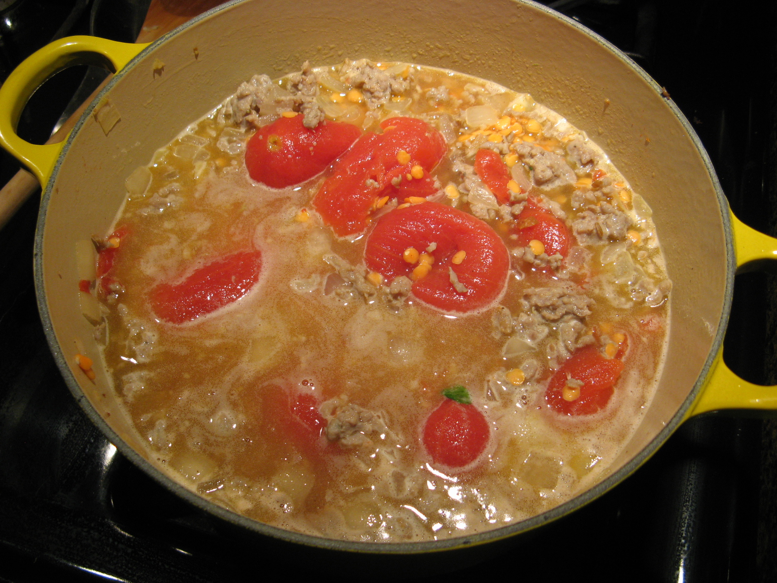 Next, I added in chicken stock, stirring and scraping to loosen any browned bits from the bottom of the pot. I then added in lentils, whole peeled tomatoes, salt and pepper and brought the whole thing to a boil. I then reduced the heat to medium-low and simmered the soup until the lentils had softened. As the soup simmered the tomatoes began to break down as well.