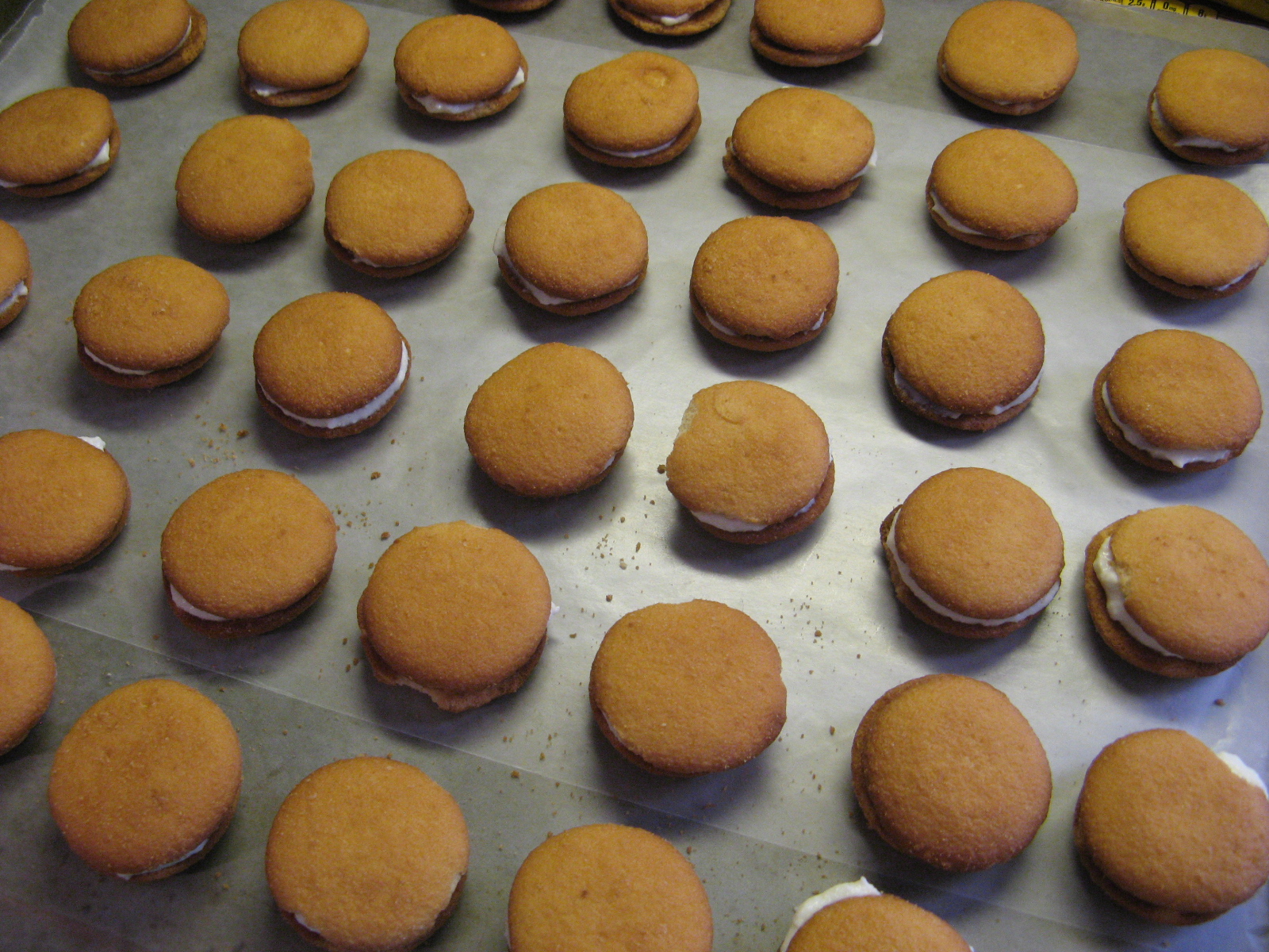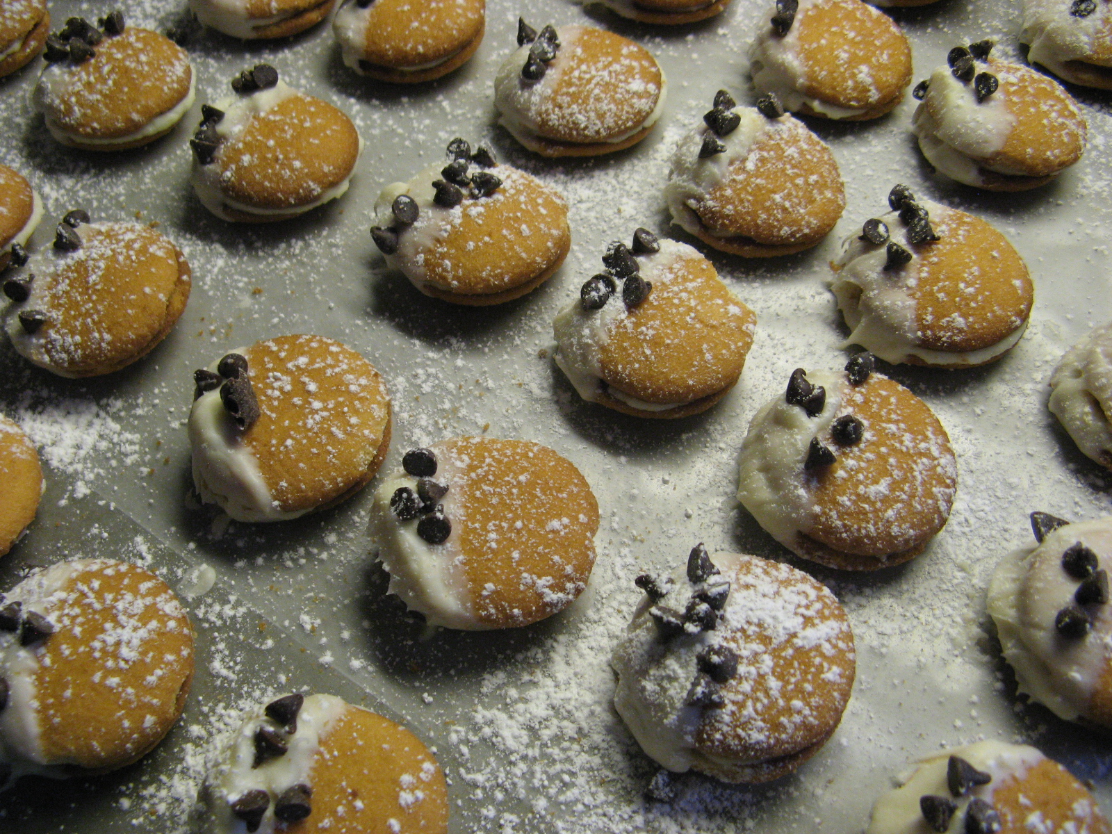 Next, I spread a teaspoon of the filling on the bottom half of the vanilla wafers and then topped them with another wafer.