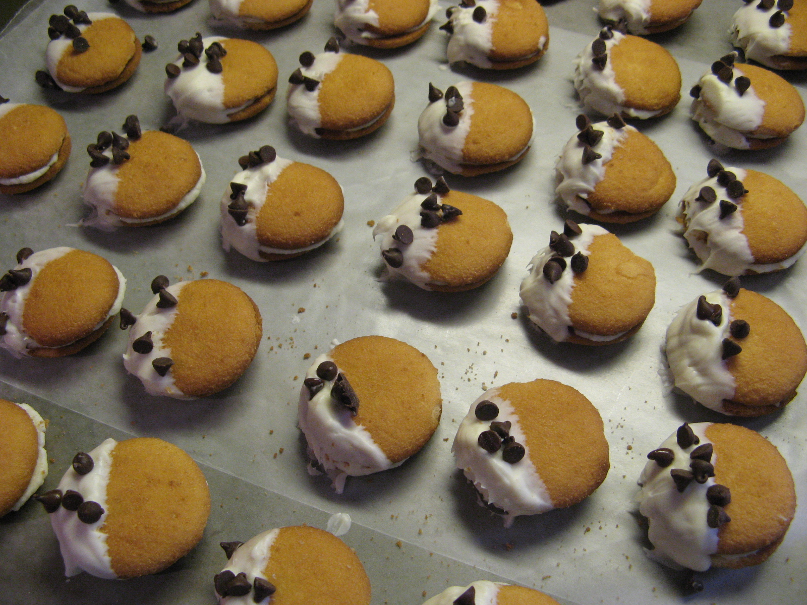 I dipped each of the sandwich cookies halfway into melted white candy coating – I used White Wilton Candy Melts. I dipped about five cookies at a time and then sprinkled mini chocolate chips on them. You don’t want the candy coating to set too much or the chocolate chips won’t stick to the cookies. Once I dipped all of the cookies I placed the cookies in the refrigerator for a few minutes so the candy coating could set.