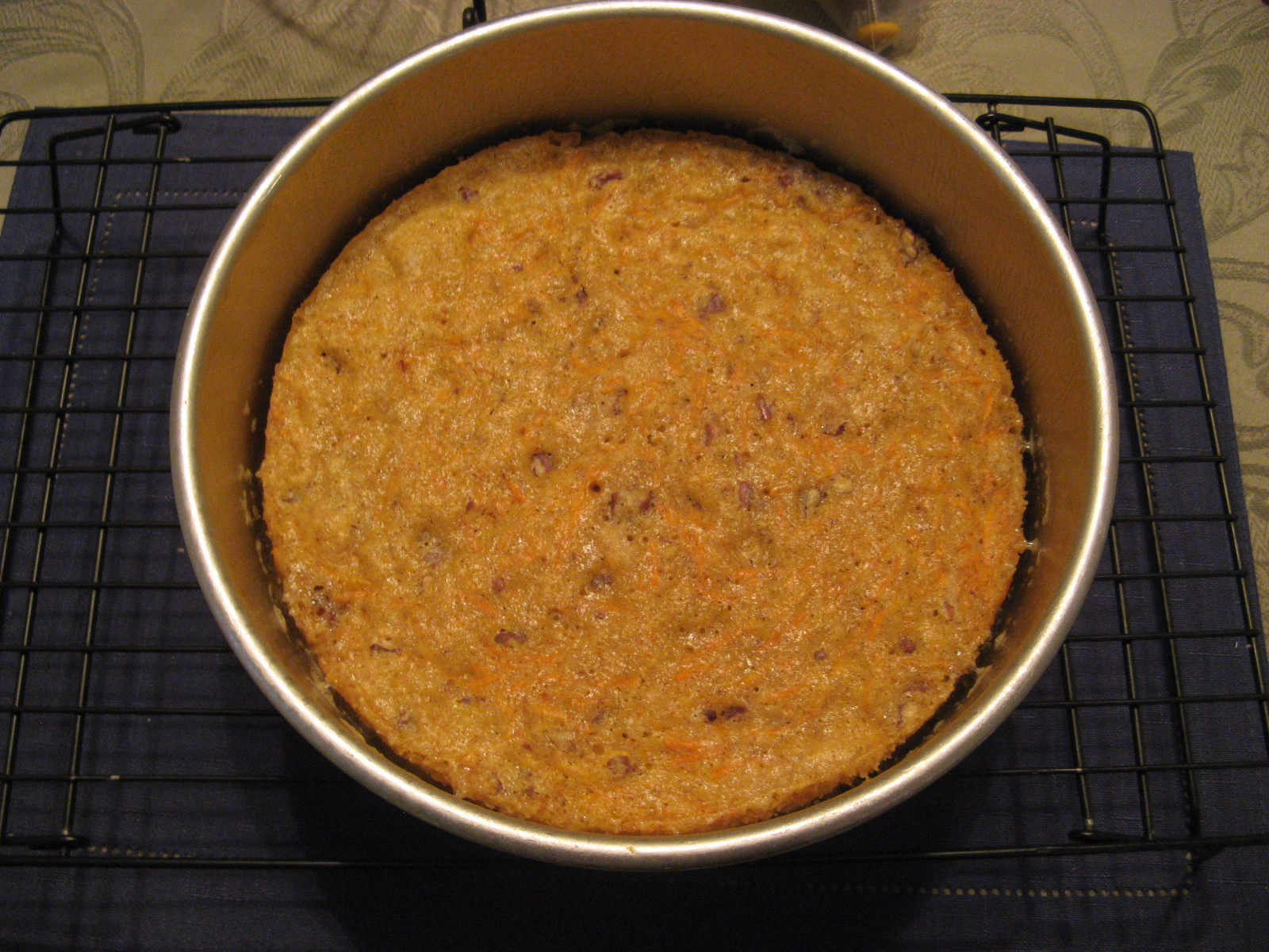 I then incorporated the flour mixture and egg mixture and folded in shredded carrots and pecans to the batter. Once the batter was well combined I transferred it to a 9-inch round pan that I sprayed with baking spray.