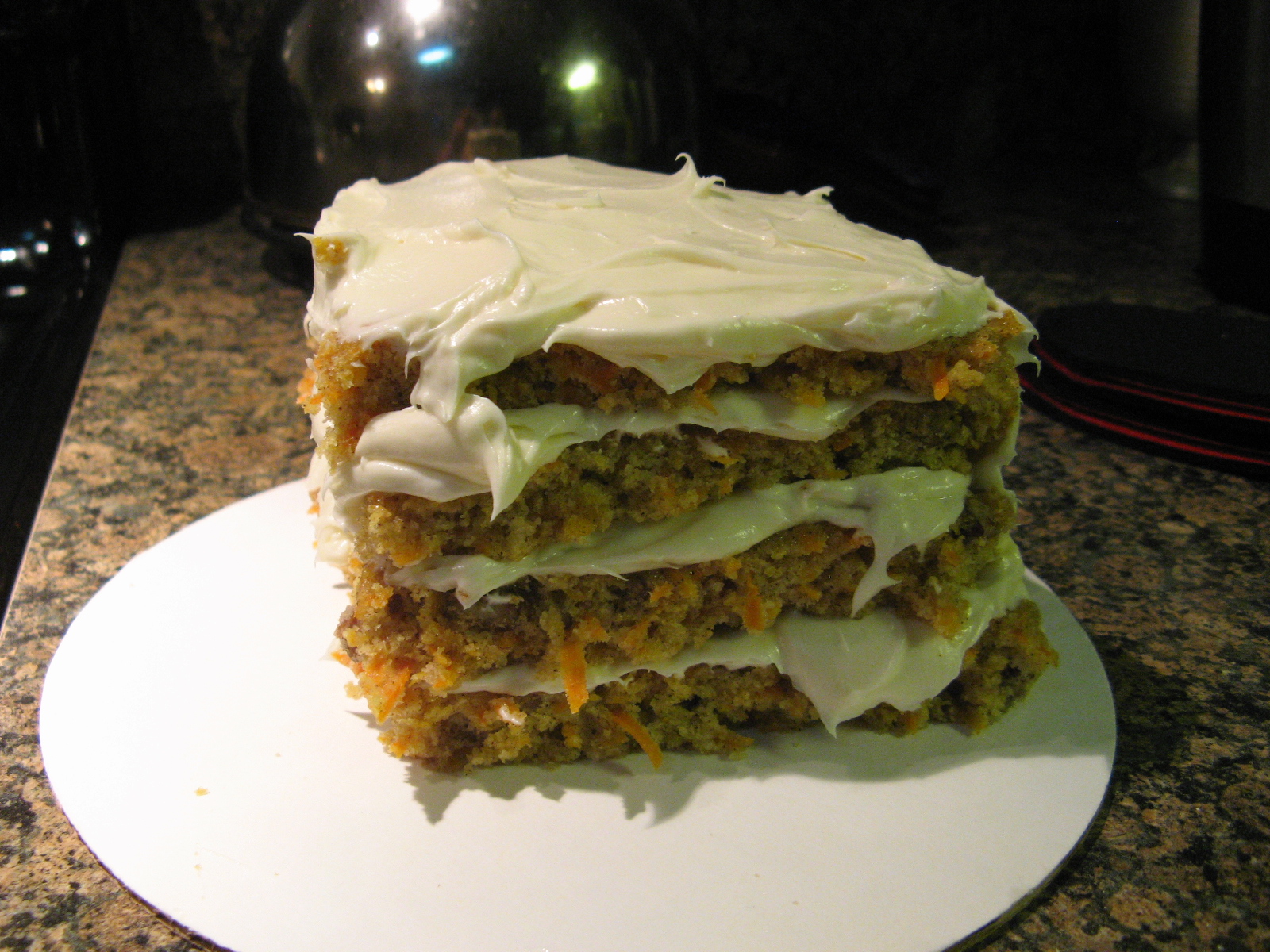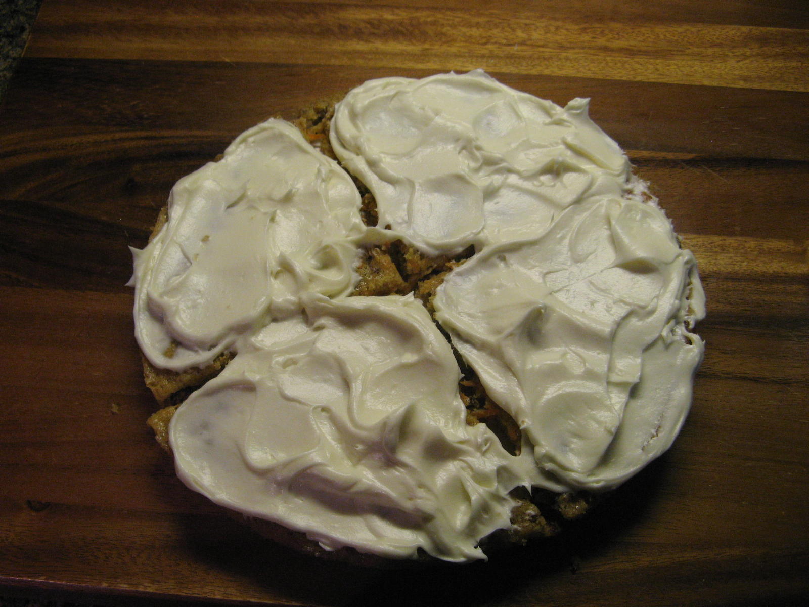 After the 20 minutes, I removed the cake from the pan and allowed it to cool completely on the wire rack. Once it was completely cooled I cut the cake into 4 equal parts and frosted the top of each piece with cream cheese frosting.
