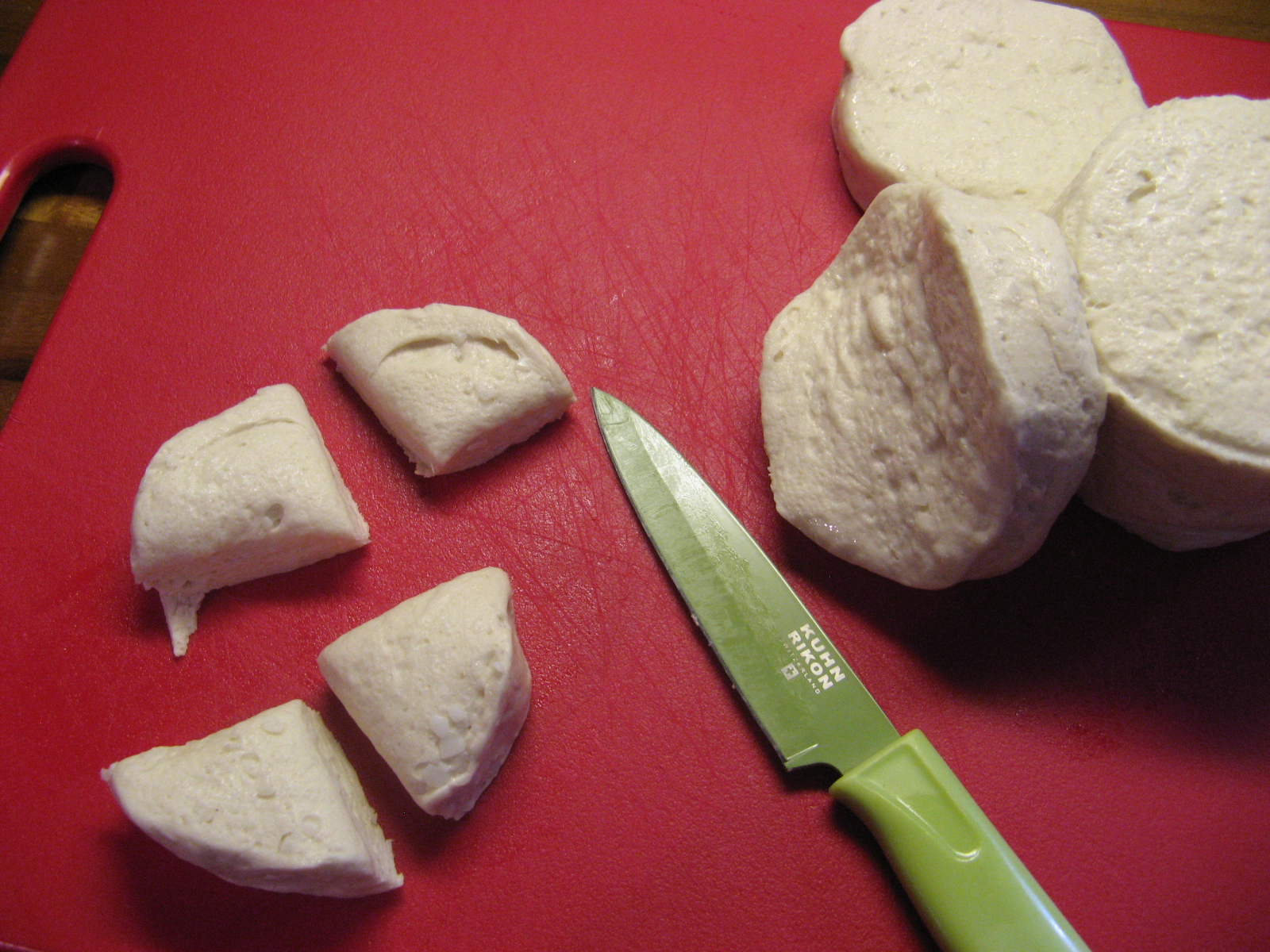 Working with 1 can at a time, cut each of the biscuits into quarters. After cutting the first can place it back in the refrigerator while cutting the biscuits of the second can.