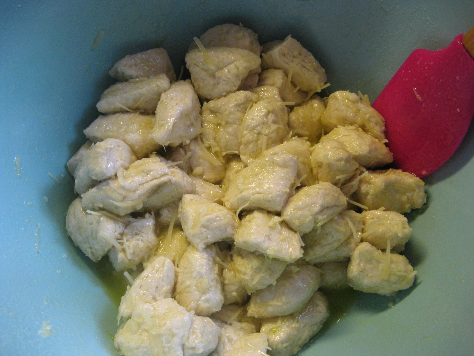I then tossed half of the quartered biscuits in the olive oil mixture and gradually added in the remaining quarters.