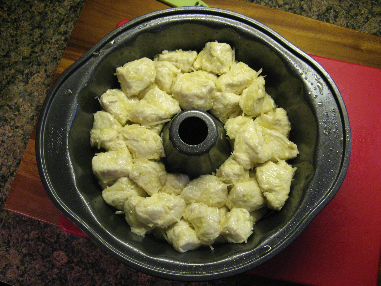 After spraying a Bundt pan with cooking spray, I layered the biscuit pieces into the pan. I opted to use my hands to spread the pieces into the pan to ensure they would be even throughout the pan.