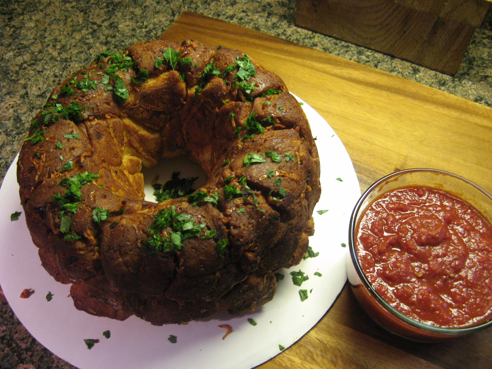 Let cool for 5 minutes in the pan and then invert onto a large plate and sprinkle with parsley. Serve with marinara sauce for dipping.